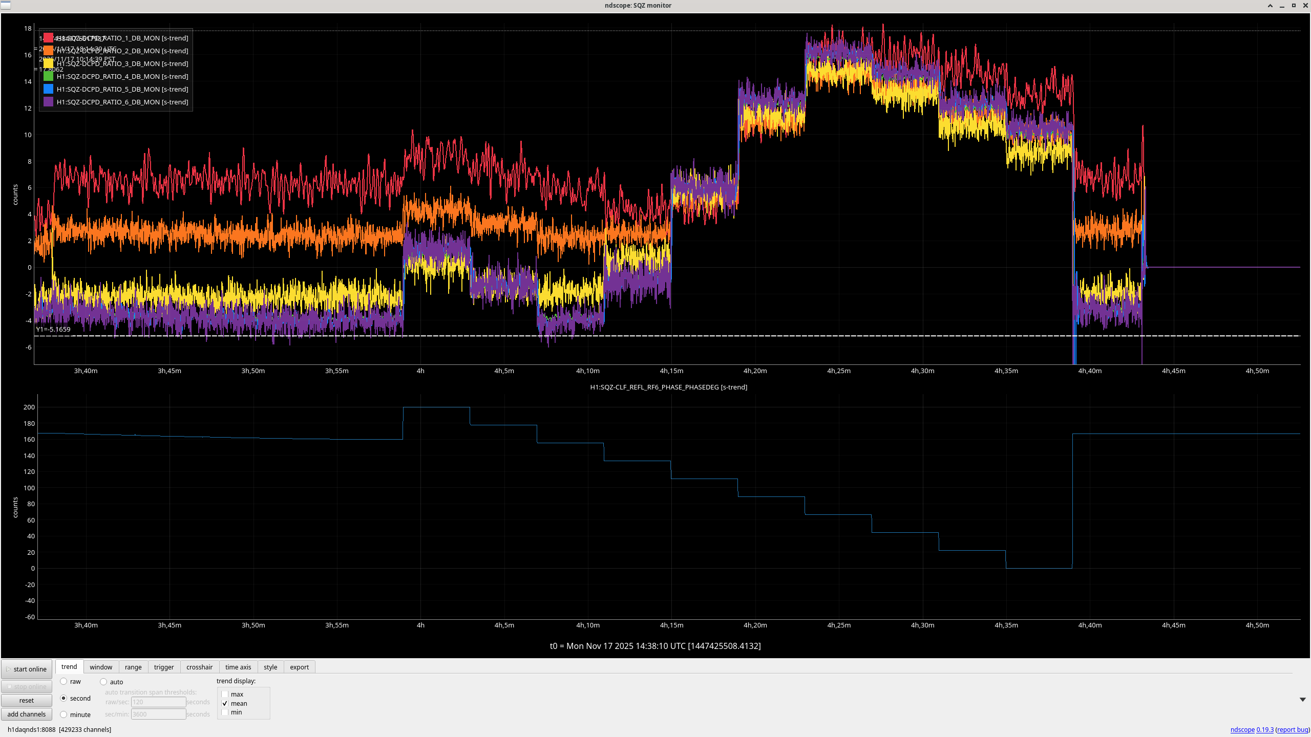Then we started a script to move the squeezing angle. I forgot to turn off the SQZ angle adjust servo for the first 15 minutes of the script, so this data isn't very useful since the ADF servo was running. Now I've added a reminder to the script if it sees that is on.