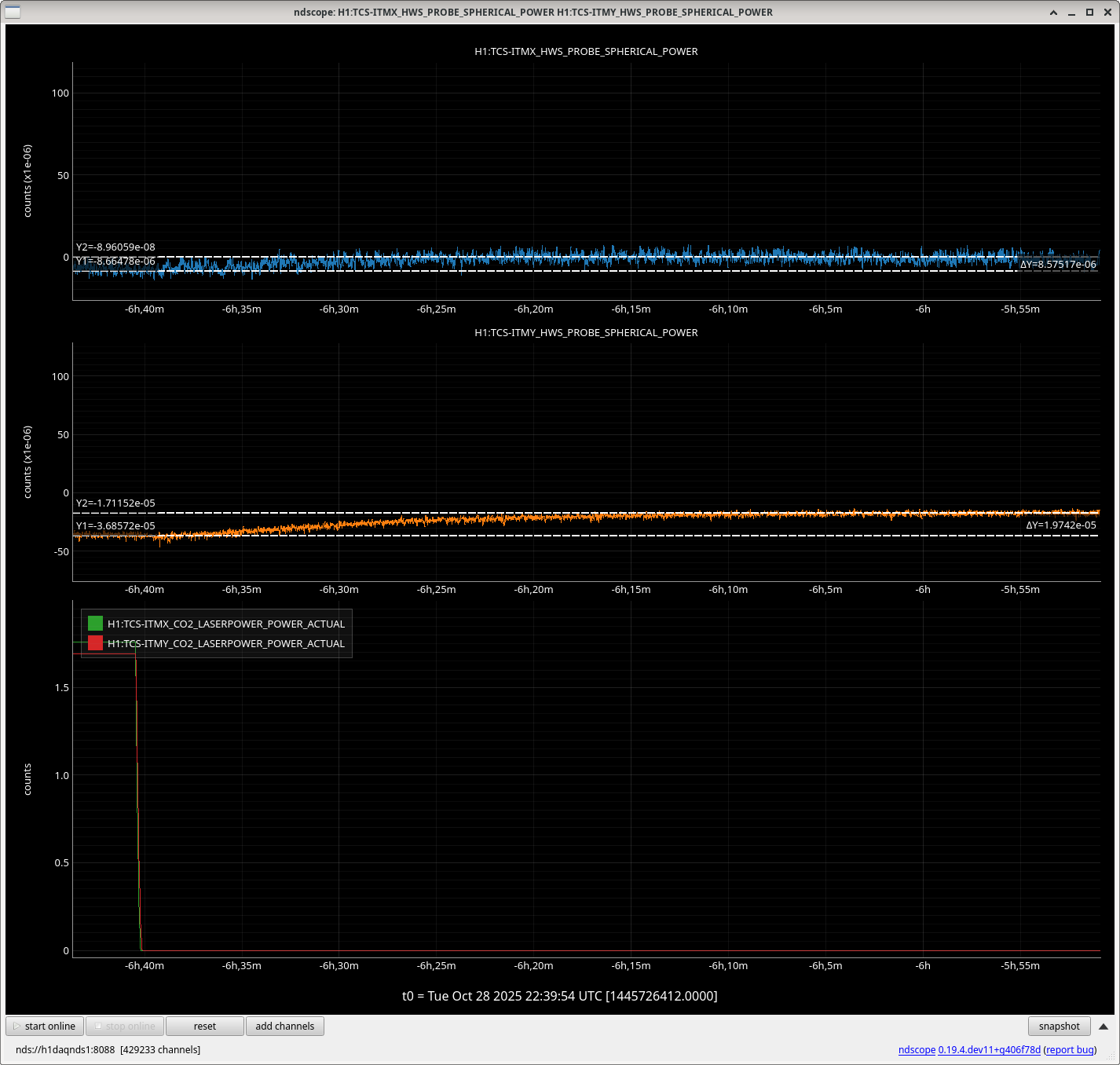 If instead, we assume ETM absorptions reported by galaxy, then the HOM spacing measurements would suggest ITM absorptions: ITMX abs = 0.678ppm, ITMY abs = 0.321ppm, half of what the HWS on ITMY reports. Some evidence that may support this is turning the CO2s off separately after the IFO cools off, where ITMY HWS reports twice the defocus as ITMX HWS. I do not have any models of this to corroborate this but it is interesting (the HWS SLED was just replaced for ITMX).