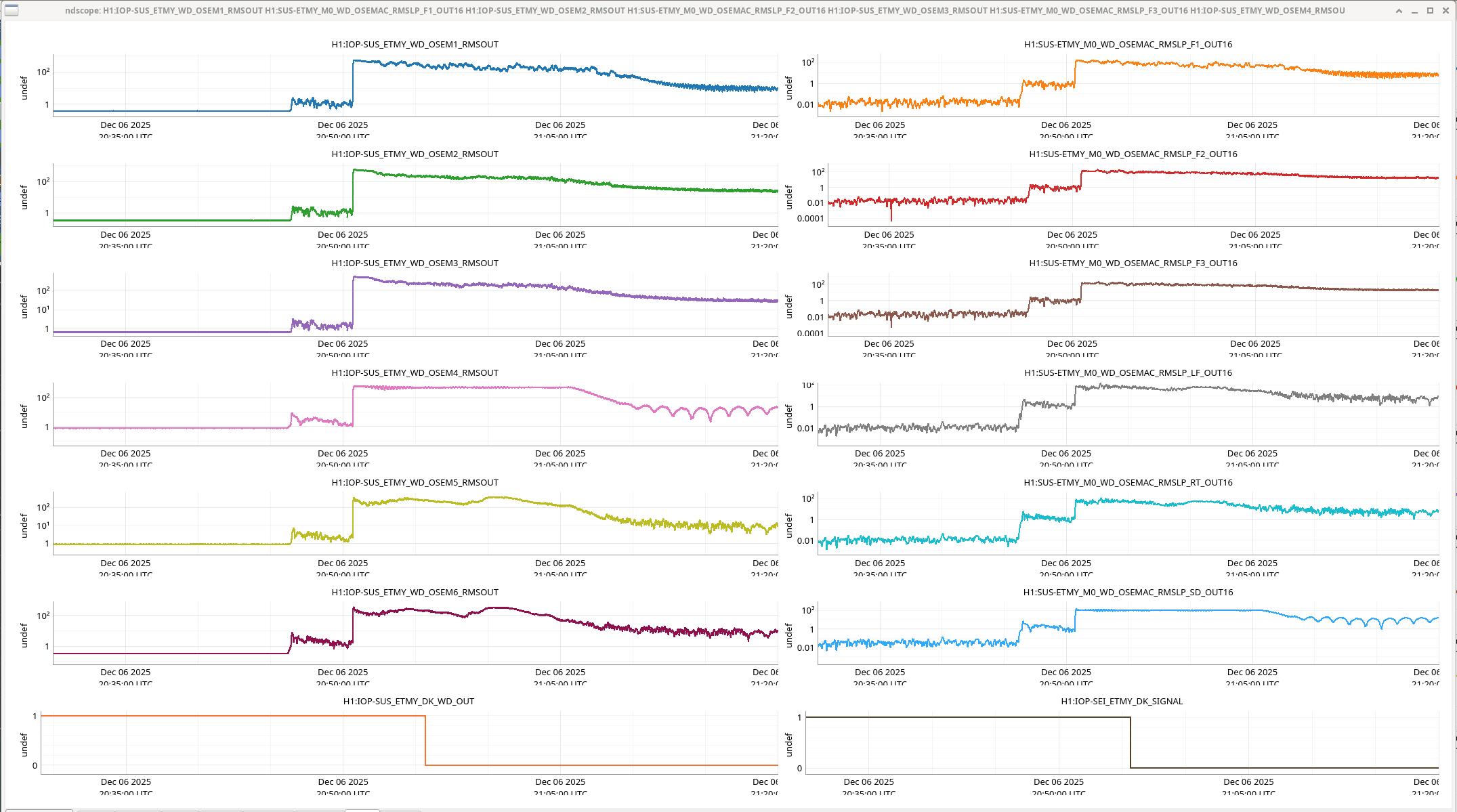 SUS-ETMY sees the very large motion, increasing to ~100 ["um"]_RMS (with USER WD threshold set to 150 ["um"]_RMS) -- USER WD never trips. But -- peak motion is oscillating to the 300 ["um"]_peak range (but not close to saturating the ADC.)