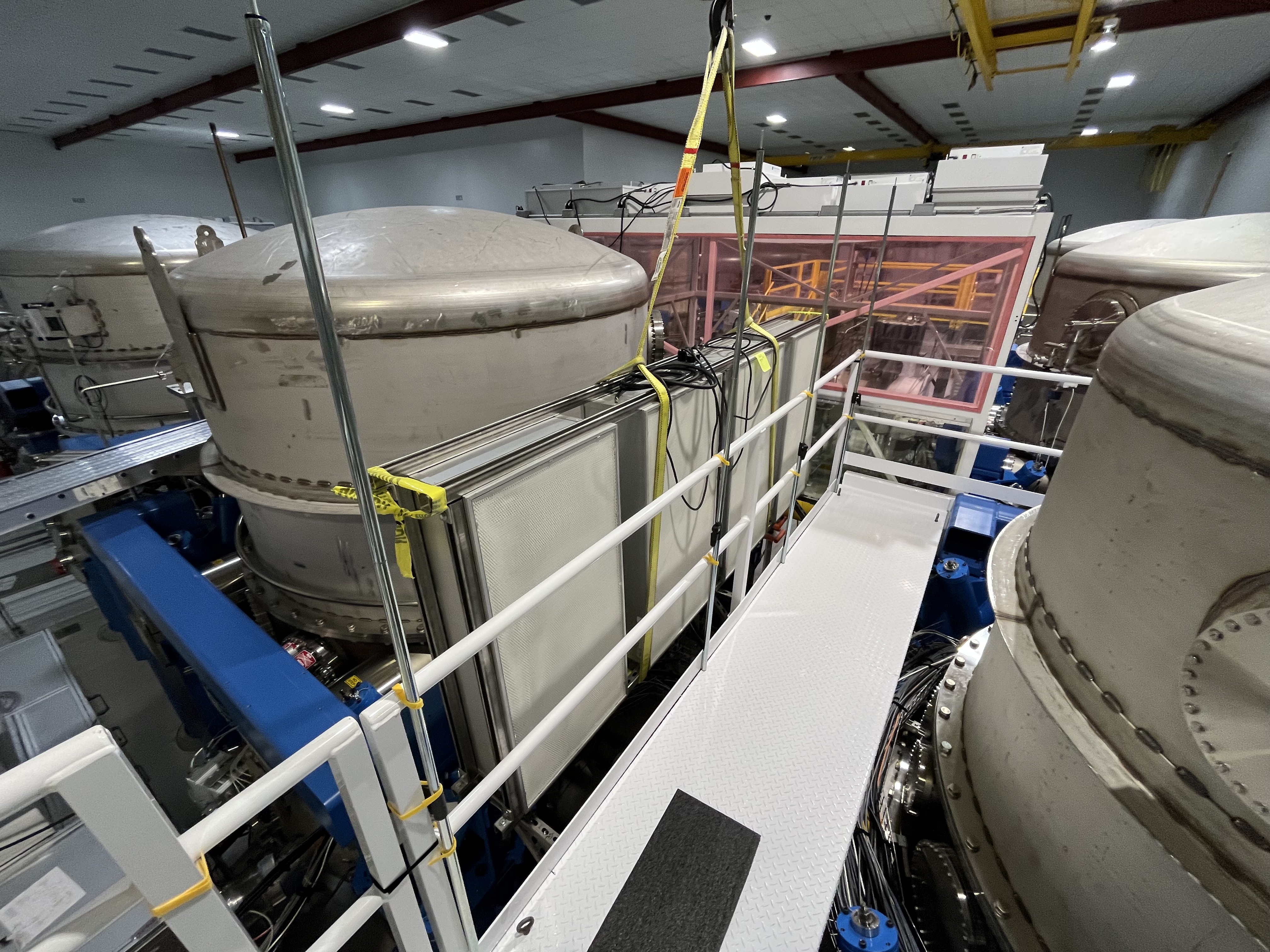 In preparation for the upcoming Bigger BeamSplitter Suspension (BBSS) Installation at BSC2 in a few weeks (~midMarch), a new type of cleanroom infrastructure was needed too allow for more vertical space for the cartridge to be craned in/out of BSC2. Instead of using our standard large mobile cleanroom (which are used for HAM & BSC chamber work), a smaller clean space will be attached to the elevated work platform for BSC2. There will be a "cleanroom tent" on this platform (here's the platform [white] with 2-sets of 4 "tent poles") and a new array of (qty-4) HEPA Filters Fans (same type as the ones on top of the large mobile cleanrooms which blow down) will be on the side of this cleanroom tent to push air flow horizontally for this elevated workspace for the BBSS install.