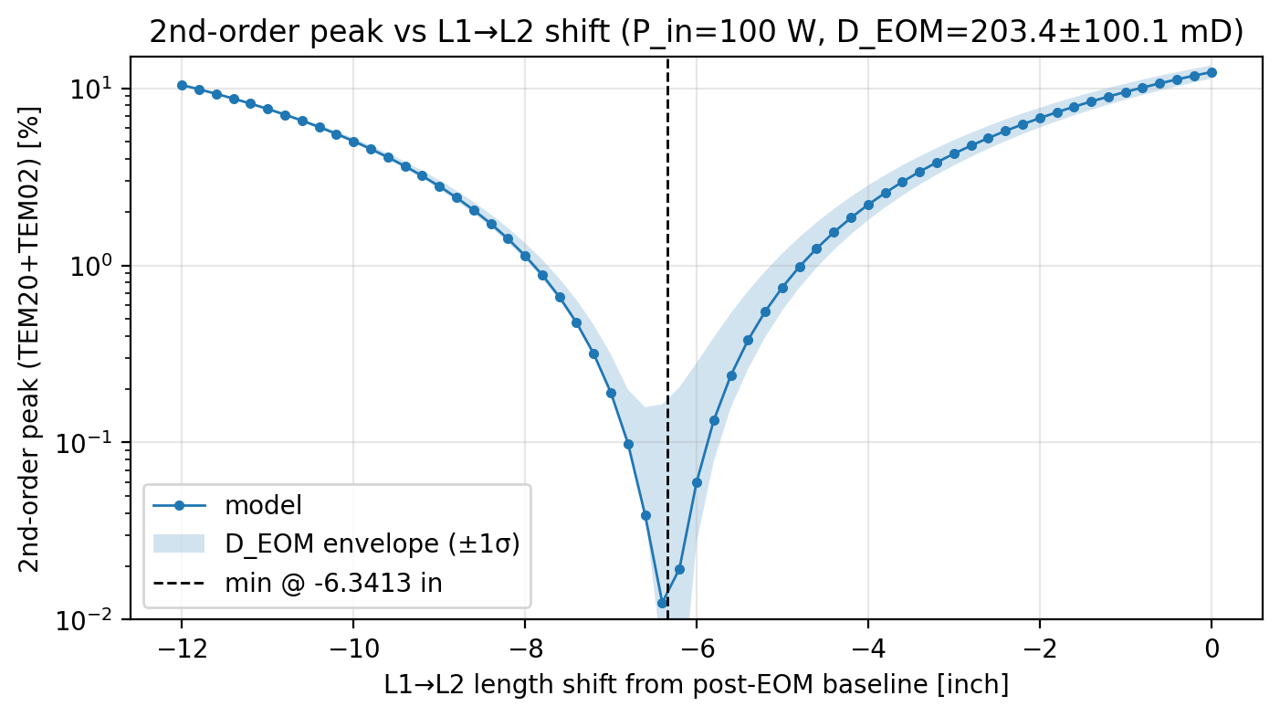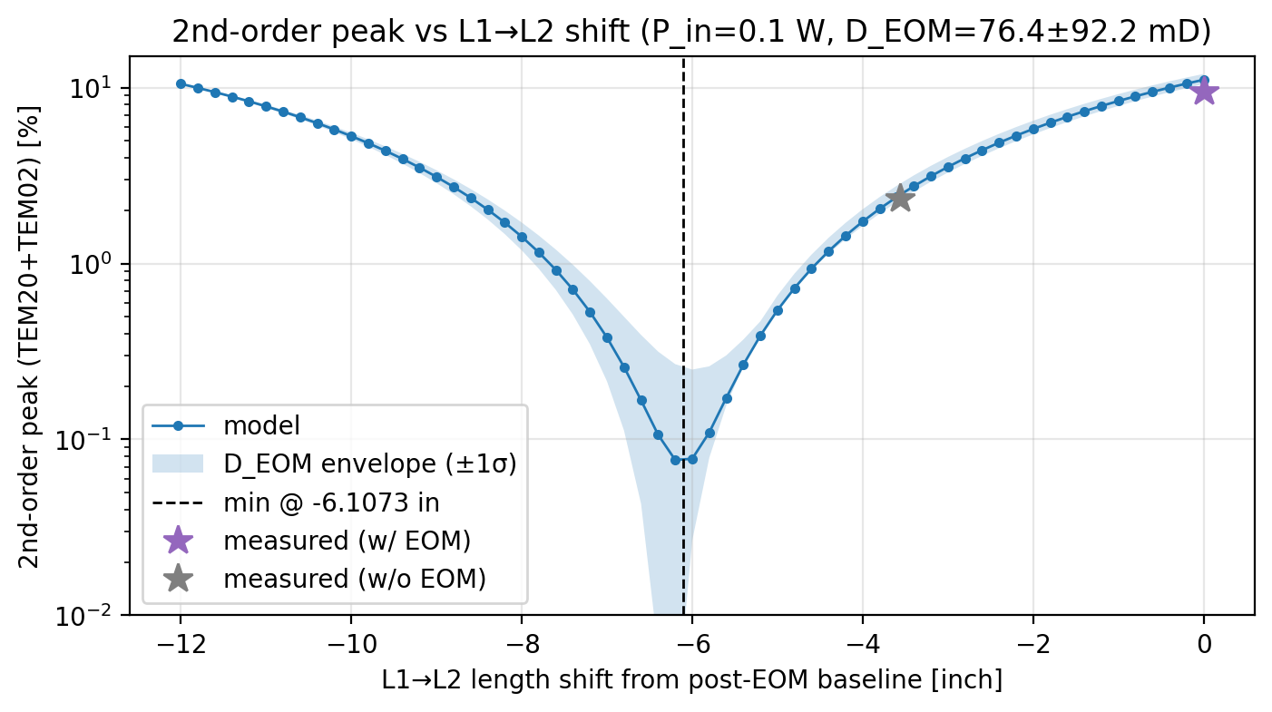 The measured 2nd-order mode fractions obtained from the IMC scan (reported in the previous post) are overlaid on the same plot for direct comparison.