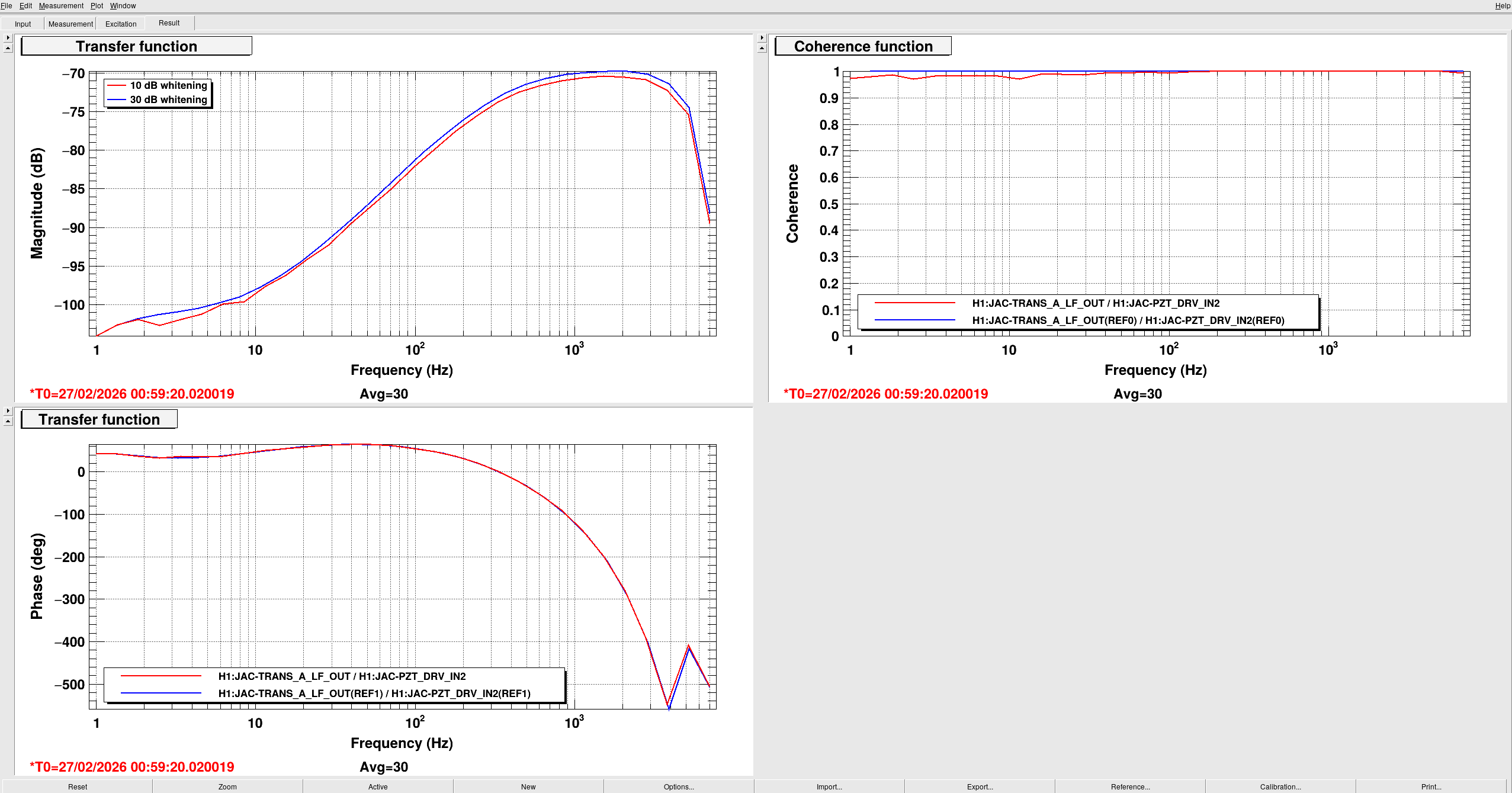 See the attached plot. The red measurement was at a whitening gain of 10 dB in Beckhoff with the -10dB filter engaged on the JAC TRANS A LF filter bank. The blue measurement is with the whitening gain at its nominal of 30dB, with the -30dB filter engaged in the filter bank instead.
