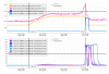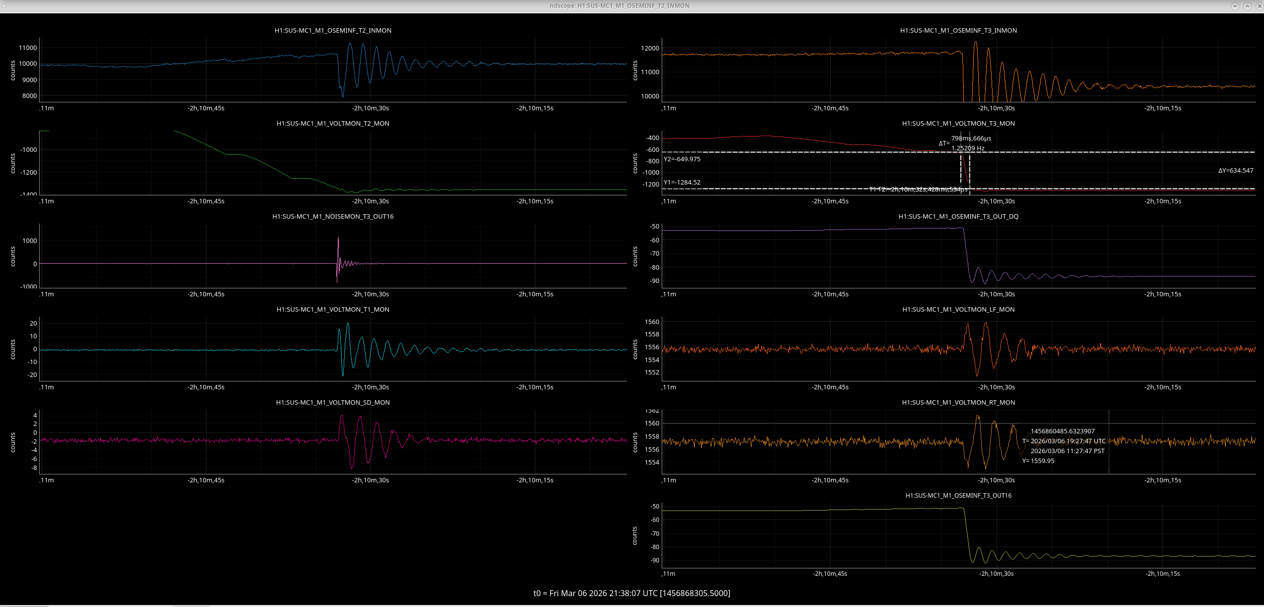 I was adjusting the alignment of MC1 pitch earlier, when the suspension had a large alignment shift that wasn't caused by a change in the requested drive to the DACs. The attached screenshot shows my requested alignment shifts in opticalign, and the resulting change in the requested DAC counts on T2 + T3. There is a sudden 420 urad jump in the osem readbacks from pitch, and a 133 urad jump in roll at the first time cursor. The master outs only see a few cycles on oscillations, which probably is from the damping loops responding to the jump, but they settle to the same requested drive as before the jump. The jump seems to be real as the IMC flashes disappeared at this time.