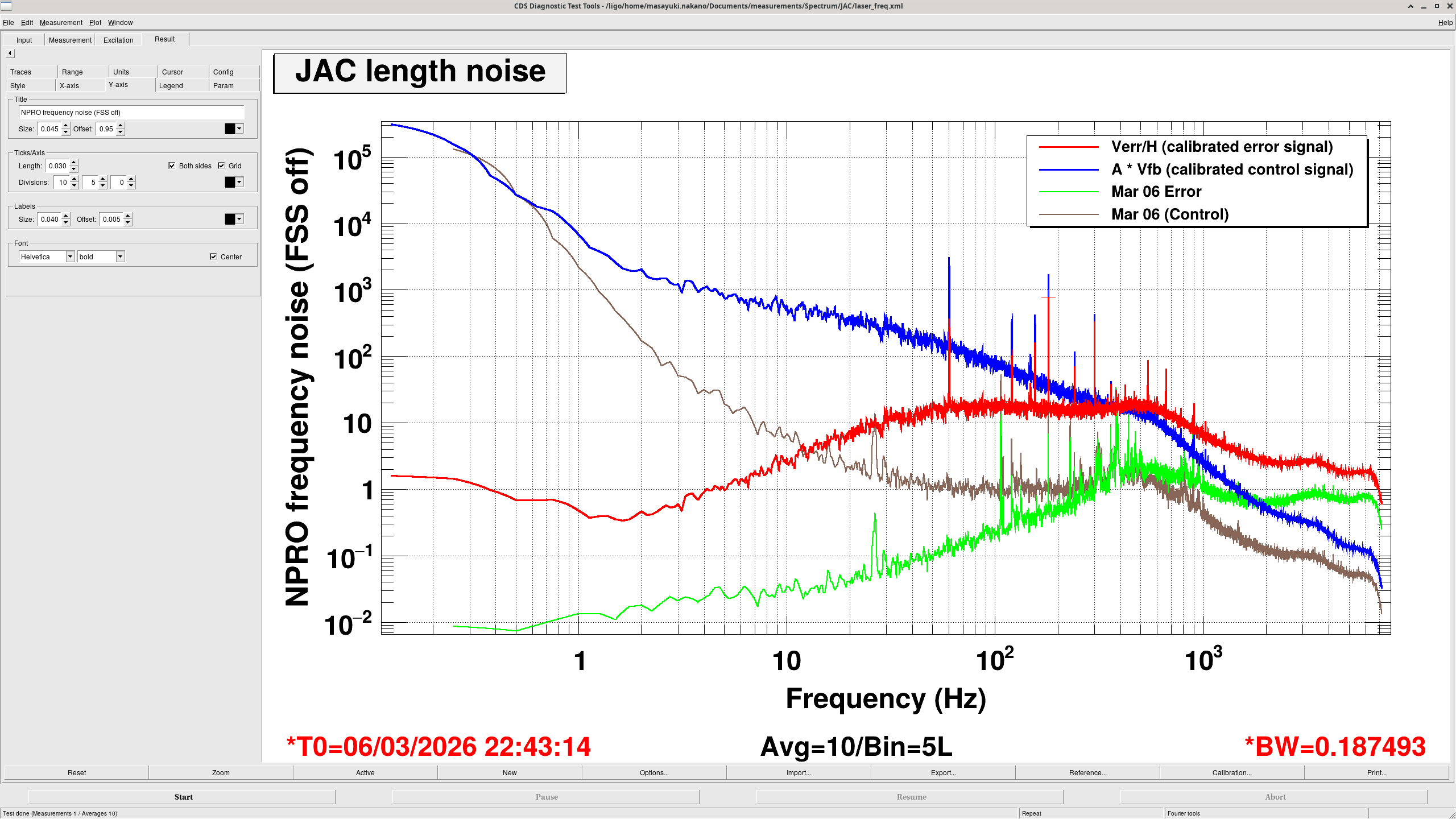 As a sanity check, the same measurement was repeated with the FSS unlocked. In this measurement, the vertical axis was converted into laser frequency noise by multiplying the calibrated length signal by