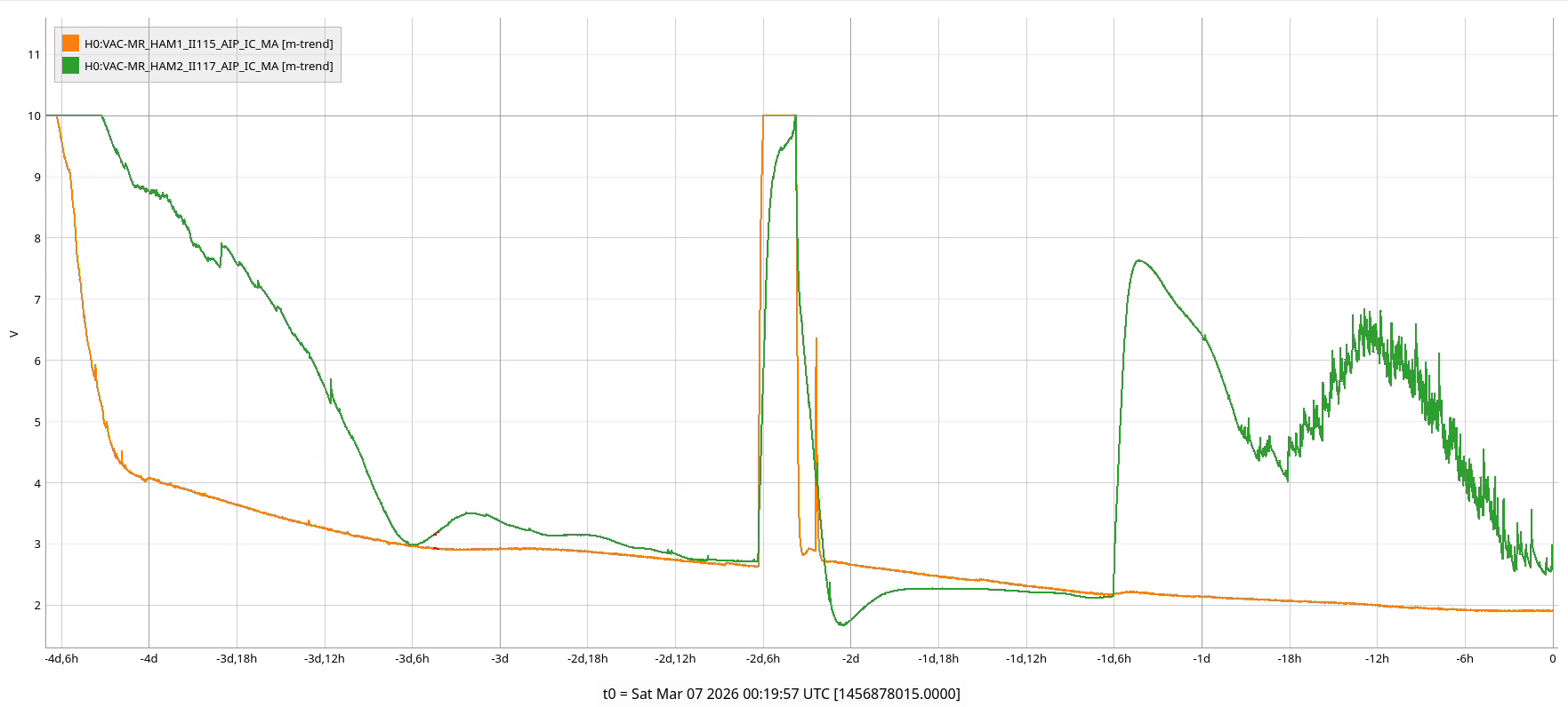 Last Tuesday, 2/24/2026, HAM7 ion pump was introduced to the chamber's main volume, and currently the chamber is pumped with both; the ion pump and the turbo pump. Attached is a trend snap of the chamber's pressure since the introduction of the ion pump.