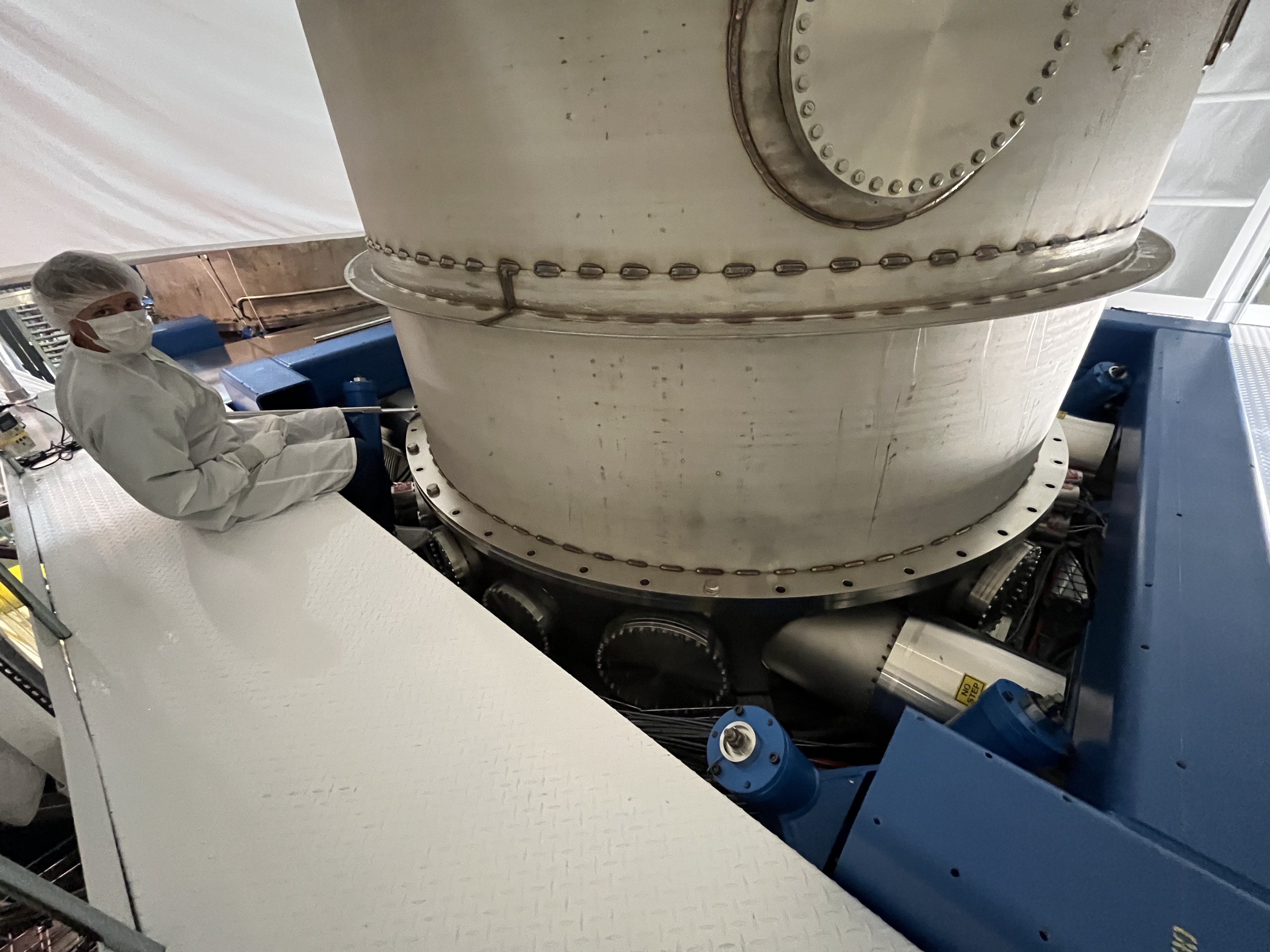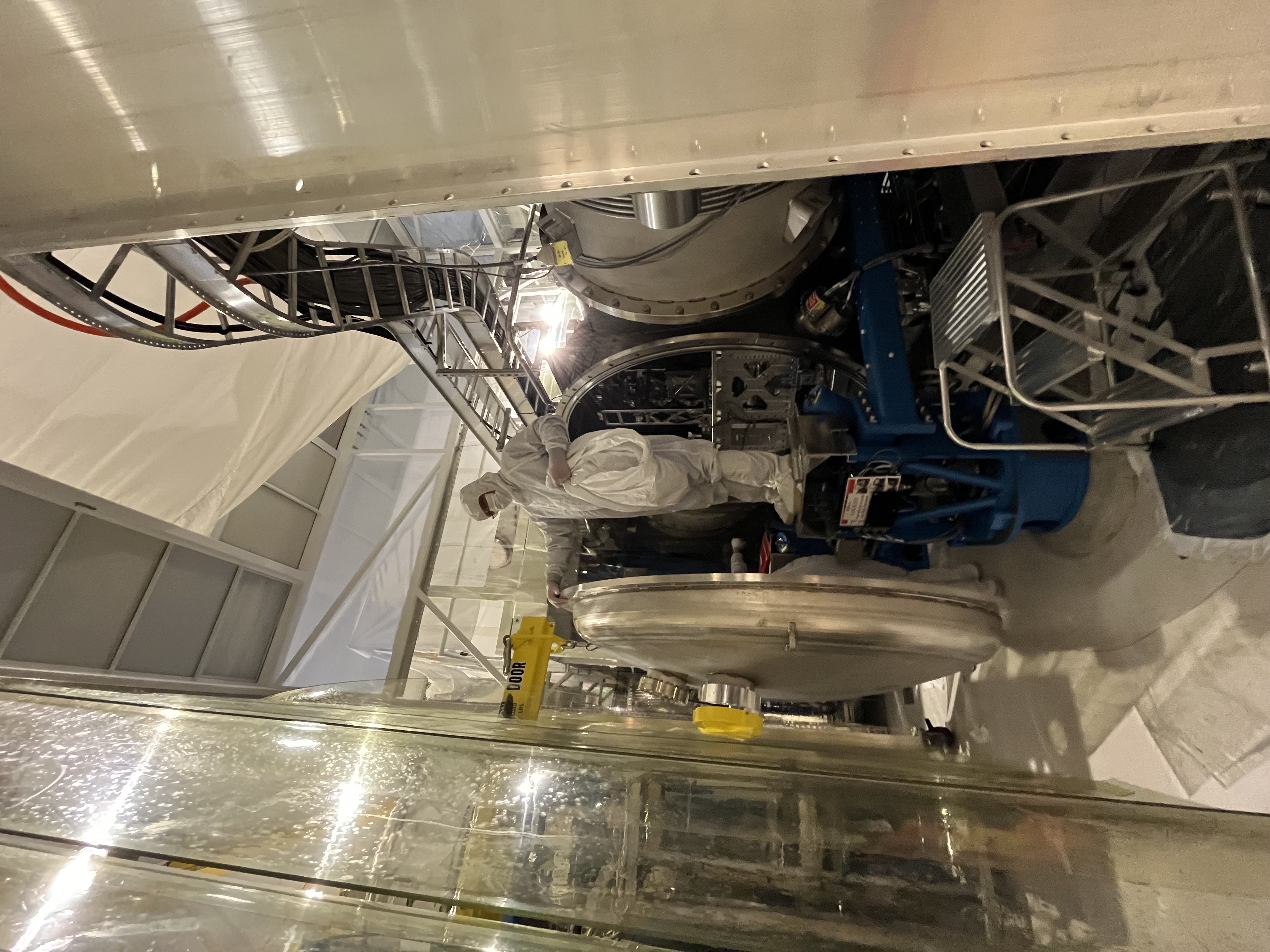 We attached the engine hoist to the door and loaded the engine hoist with the door. After some struggle the door was convinced to detach, the outer O-ring left its groove on two spots, top and bottom about 10 inches for each side, we could not get to the top O-ring very hard to reach, no space, so we just managed to unstick it from the door flange and left it out of the groove. Door was removed without a problem, O-ring protectors were installed, and door covers were set on chamber and door.