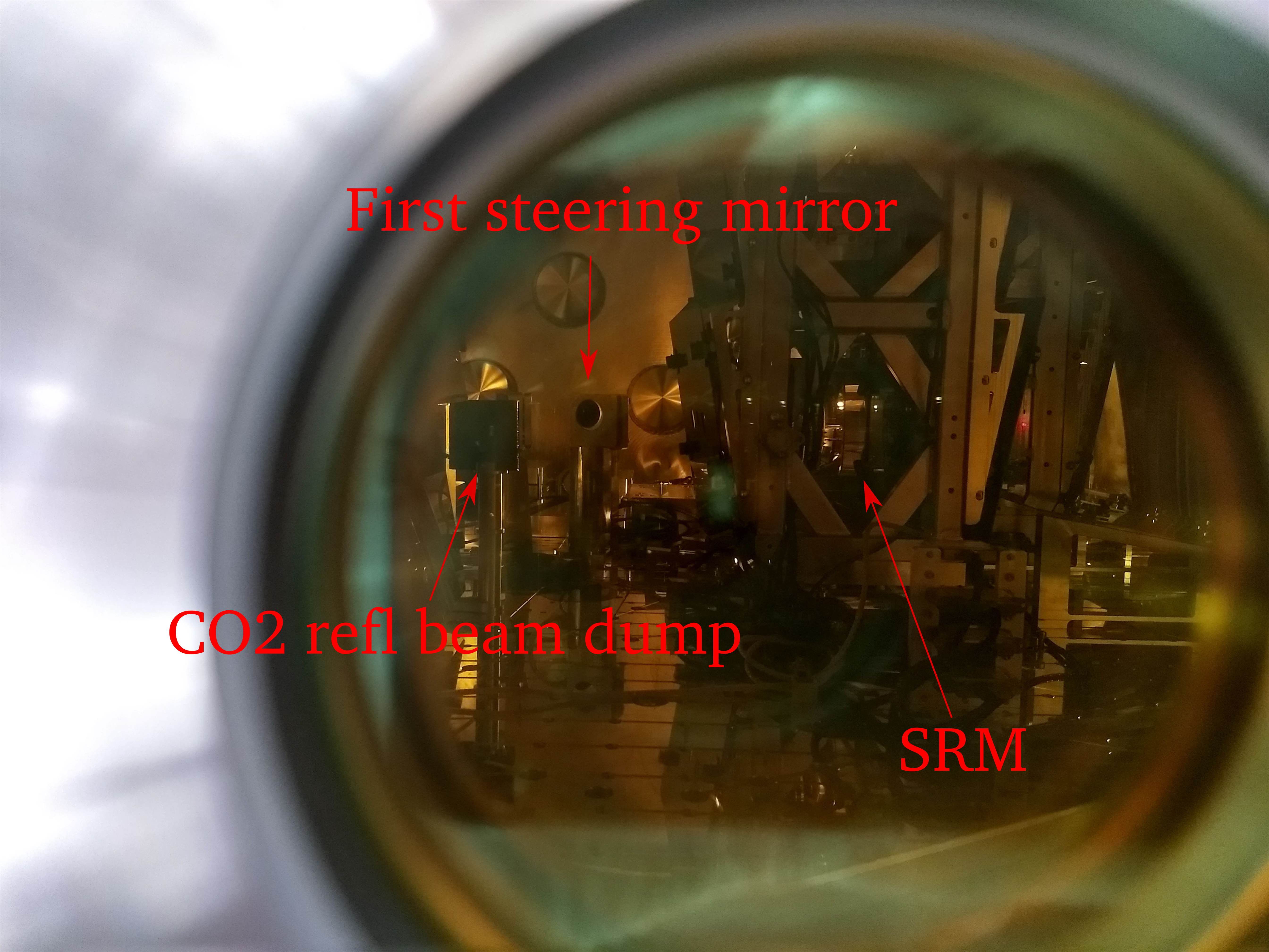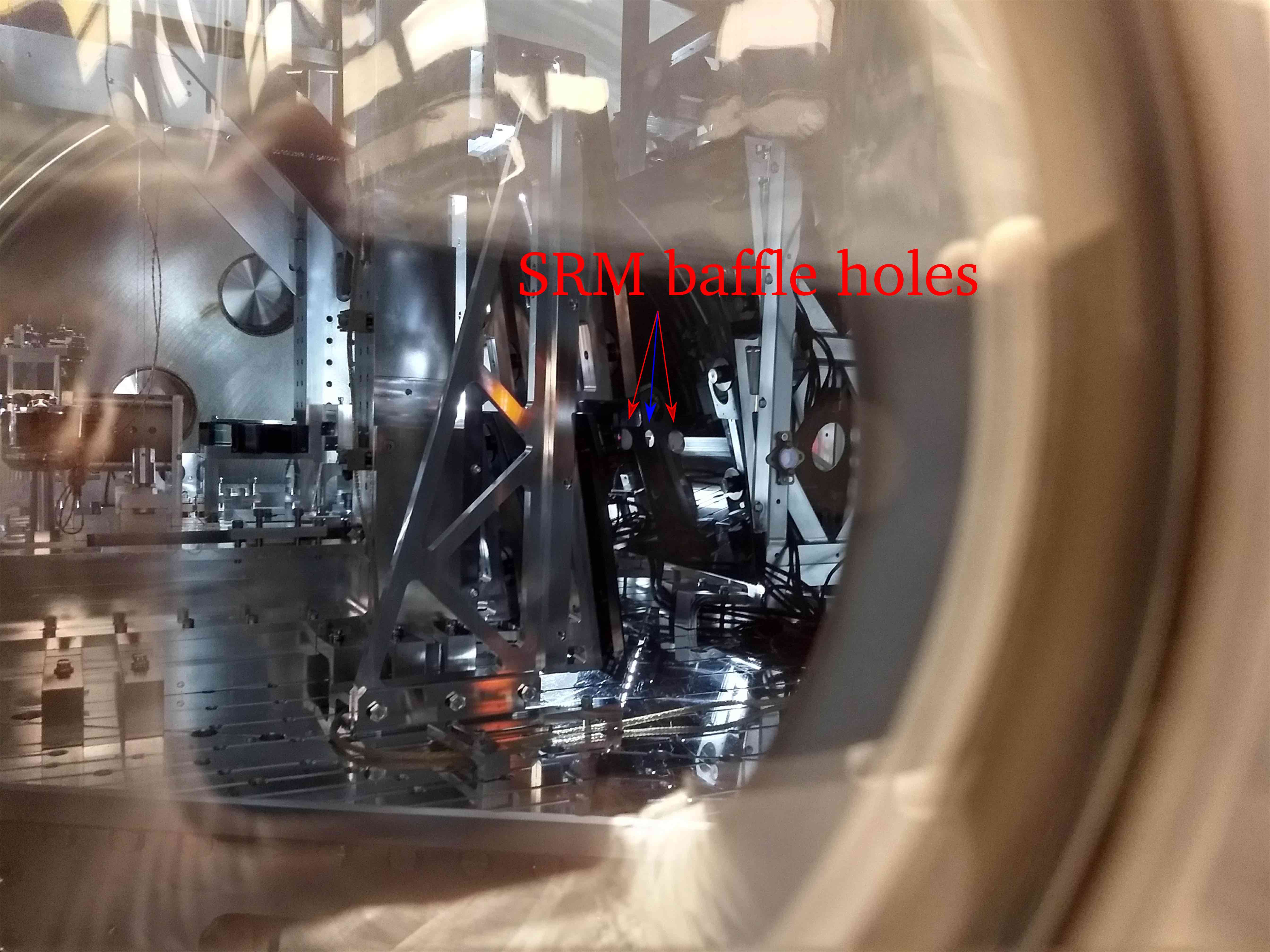 Luckily the viewport to the left gives us a good view of the SRM baffles. The hole on the left is the entry point of the CO2 laser, it then reflects off of SRM and out through the hole on the right into a beam dump. Blue is where the IFO beam comes through.