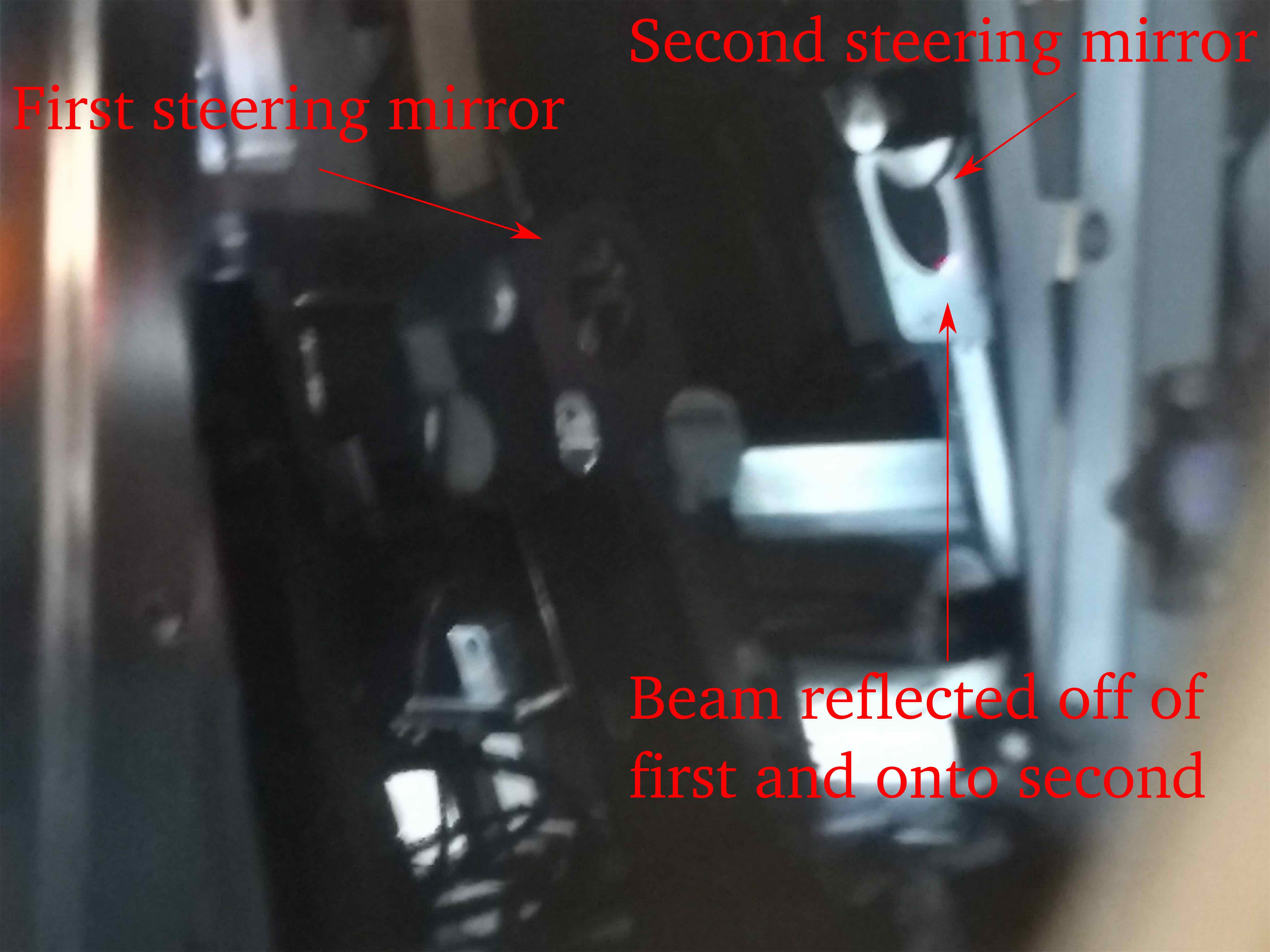 At the right angle and zooming in we get a nice reflection of the two steering mirrors from the baffle. Using this we managed to get the beam roughly centered on the first and onto the second steering mirror.