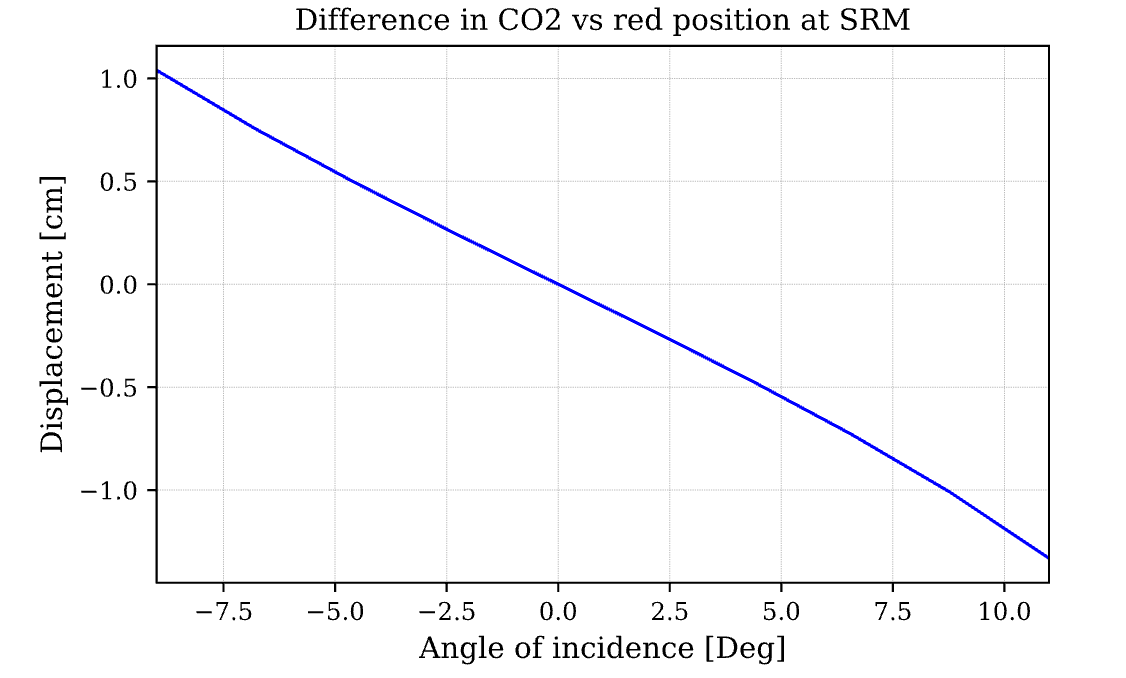 Aidan also brought up that the refractive index difference in the ZnSe viewport is 2.4 for 10um and 2.6 for 635nm, so the final spot position on the SRM is going to be different. Quick calculations show we'd be ~1cm different at the SRM per 10 deg of angle of incidence on the viewport.