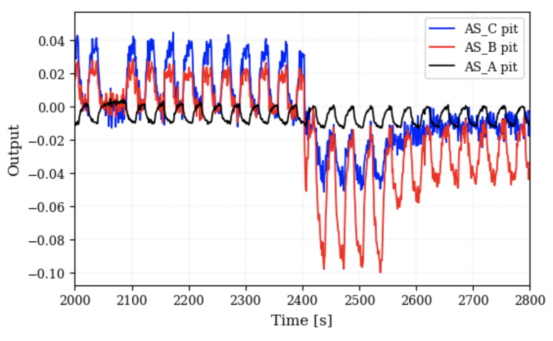 A time varying lens should not cause a change in the alignment downstream at AS_A, AS_B, or AS_C it it is well aligned to the single bounce beam. If it is displaced from it we should see variation in the alignment with the same frequency of our square wave. When we go through an optimal alignment the induced yaw/pitch should be inverted relative to the lens applied. We first found this inversion roughly by hand and then tried to fine tune it with a picometer. We aren't capturing the pico positions or the CO2 output power data to plot at the moment. However we were able to find inversion points in pitch and yaw for AS_C. For pitch this happened around the 2400s mark and yaw 2100s. The final rough alignment of the red beam position on the SRM HR baffle and periscope screw positions are shown for reference.