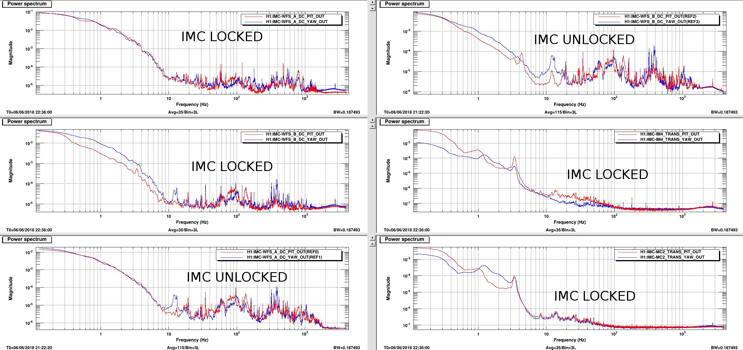 - Two panels labeled "IMC LOCKED" show the same signals as in the previous case (WFS spot position): the structures that are visible here are the same we see when the IMC is unlocked, just with lower SNR