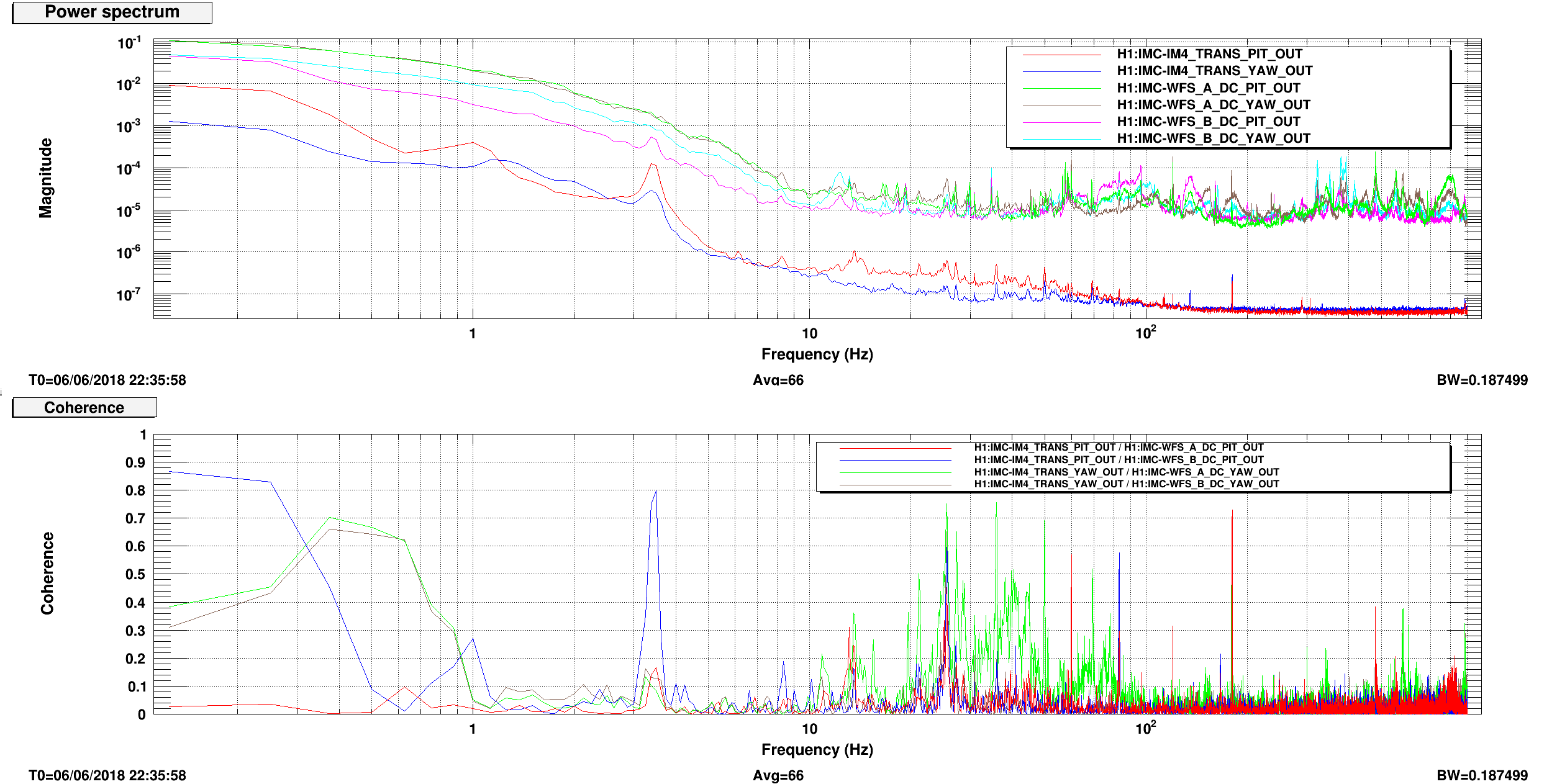 Then, we increased the input power to 18 W, and looked at IM4_TRANS. There isn't a lot of signal-to-noise ratio, but there is clearly coherence between the jitter as measured by the WFS and the (small) signal measured on IM4. Moreover, the WFS see similar jitter when the IMC is locked and when the IMC is unlocked. Therefore we conclude that
