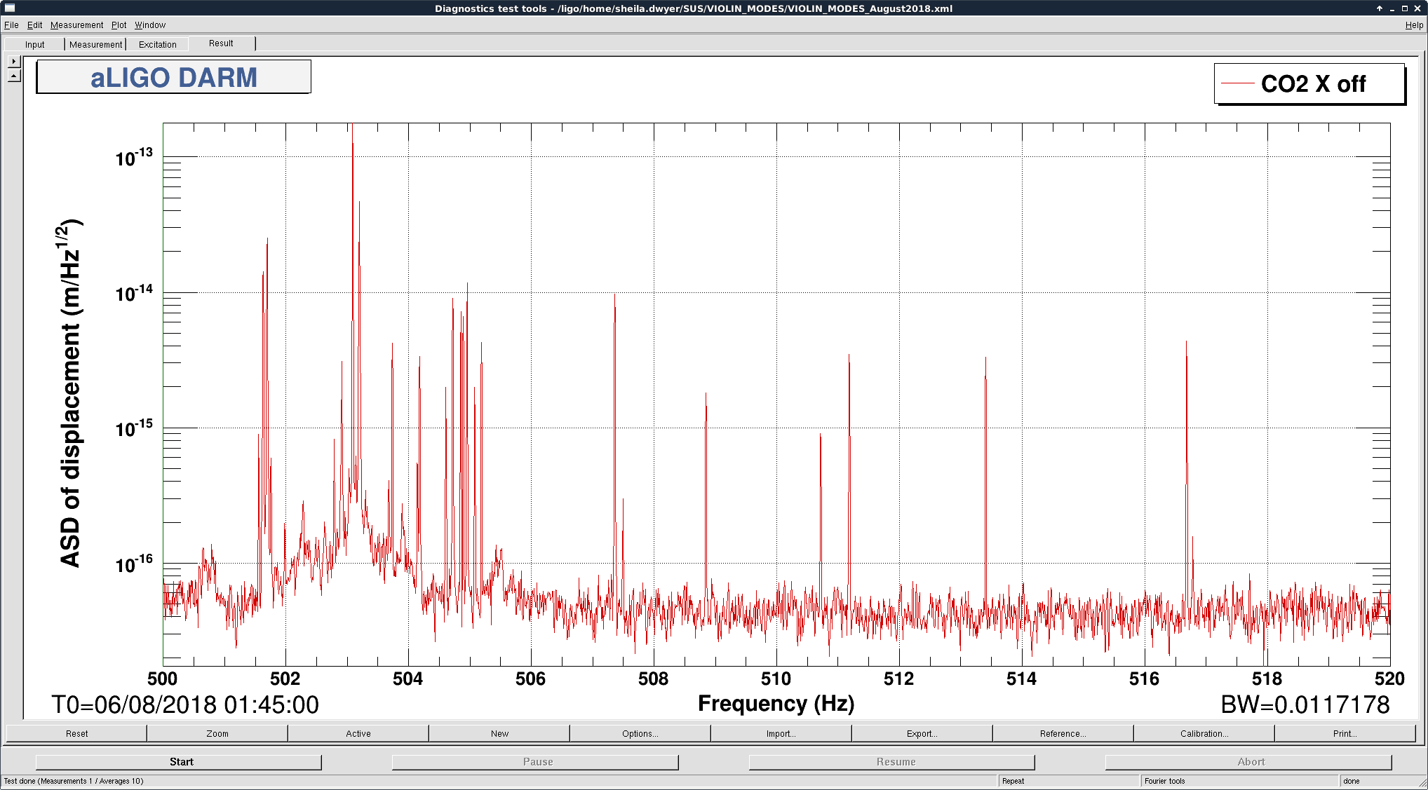 Violin modes: We had a lock stretch long enough to get a decent resolution spectrum of our new violin modes from 1:40 to 2:20 UTC on August 6th (spectrum attached).  The largest peak right now is at 503.086Hz followed by 503.195 Hz and 501.695Hz. We might need to damp these before we can transition to DC readout.