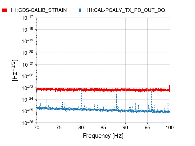 Summary: Pcal Y seems to have a bad comb structure that is likely producing contaminating lines in h(t). The behavior of this Pcal is not similar to Pcal X or either of LLO's Pcals. I urgently suggest a check is done on H1 Pcal Y to remedy the situation. Details: I was concerned that H1 low-frequency spectrum is so much more contaminated with lines than L1, so I started looking at some easy to check things, like the Pcal. Looking at summary pages, you see things like Figure 1 H1 Pcal Y. Compare that with figure 2 (H1 Pcal Y) or 3 and 4 (L1 Pcal X and Pcal Y). Comparing H1 Pcal Y spectrum to GDS-CALIB_STRAIN, I find that many lines are very close to the noise floor. This is very concerning for long duration searches (CW and Stochastic). Figure 5 is a broad band spectrum comparison Figure 6 is a zoom on 10 - 200 Hz Figure 7 is a zoom on 70 - 100 Hz I don't think this is due to clipping on Pcal periscope because this is on the transmission module PD (so, light that actually reaches the ETM). I hope it is not that hard to solve this issue.
