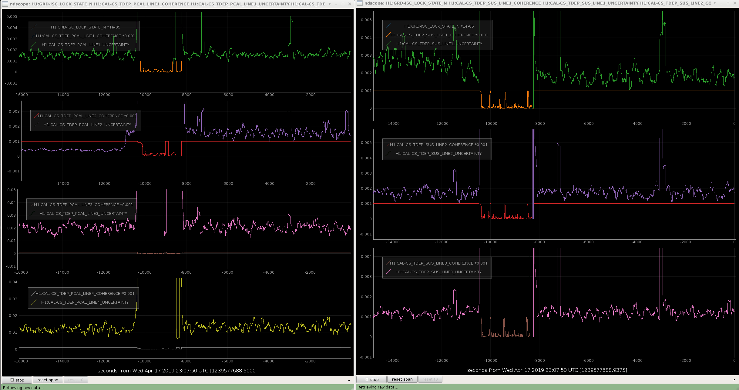 2019-04-17_TuningCalibrationLineAmplitudes_Uncertainty.png shows the time series of the uncertainty for all calibration lines over many hours before and after the line amplitude change -- the middle section is where they were turned off for the standard suite of calibration sweeps; before they were at their former value, after they were at their current value.