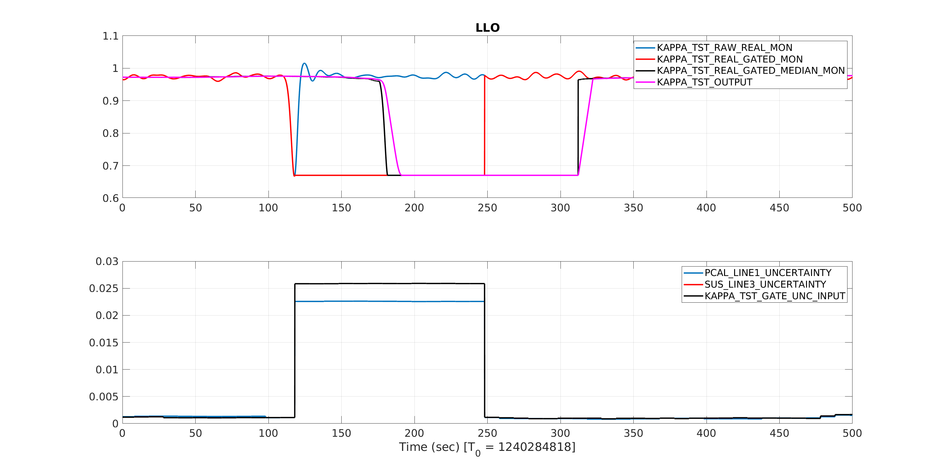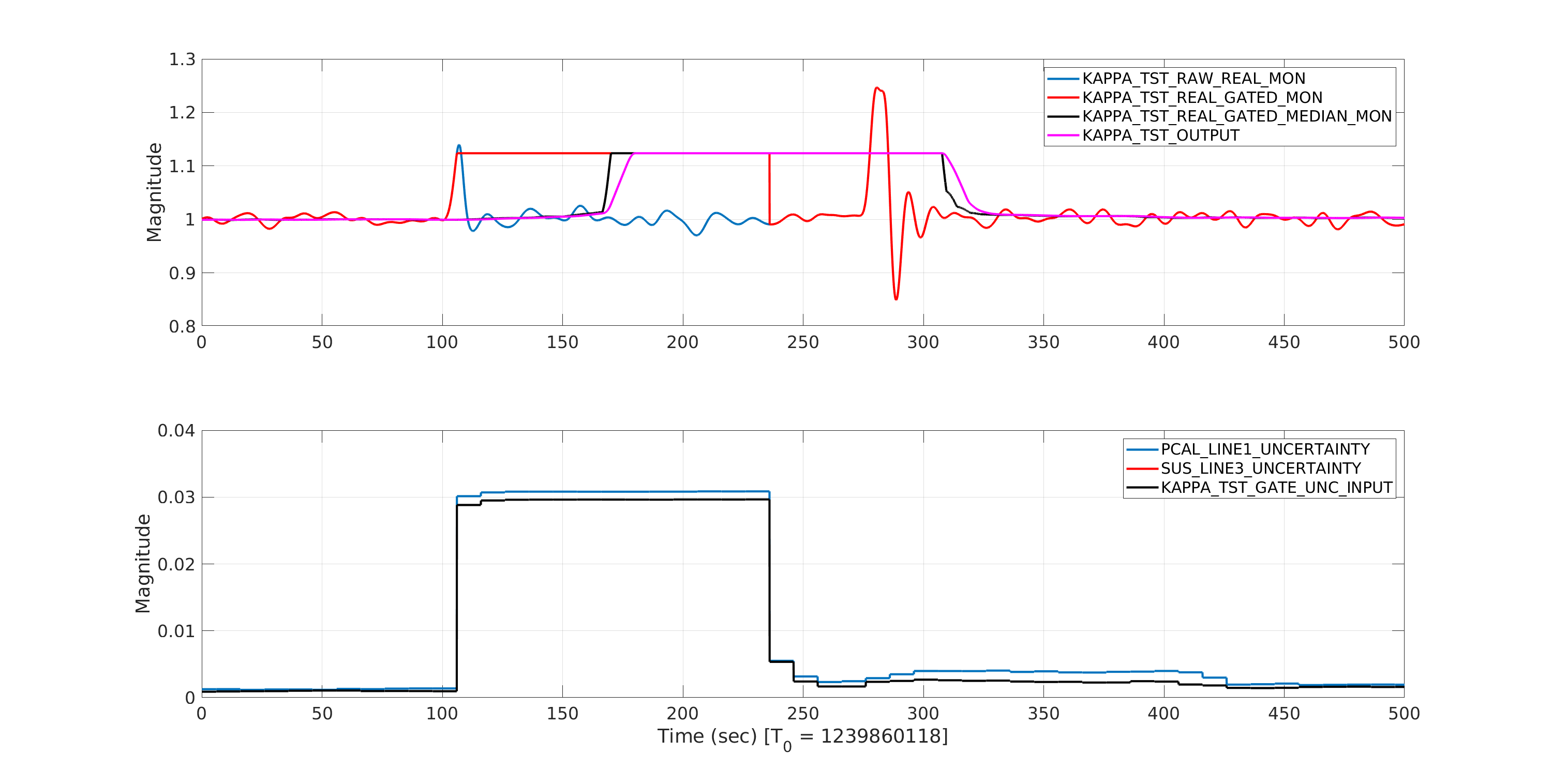 Turns out the switch blocks used were defaulting to a logic comparison of >= 0 instead of > 0. Which means the first input was always being passed. I'll update this in the common CAL_CS_MASTER.mdl file and we should be able to push that next Tuesday. The gating issue is a bit trickier. As far as I can tell the gate is doing what its supposed to do. At the time the uncertainty rises above threshold, it freezes then and there as shown in Shivaraj's plots. The problem is, since the uncertainty calculation is basically on a cadence of 10 seconds, there's a 10 second gap between the demodulated low pass starting to respond to a large excursion and the I think this means we need to put 10 seconds (or maybe a touch longer) buffer between the kappa value input to the gate, so that the coherence corresponds represents the data coming in instead of data that came in during the last 10 seconds. A 163840 or so sample ring buffer is doable, but I'll have to modify a C code user block to do so.
