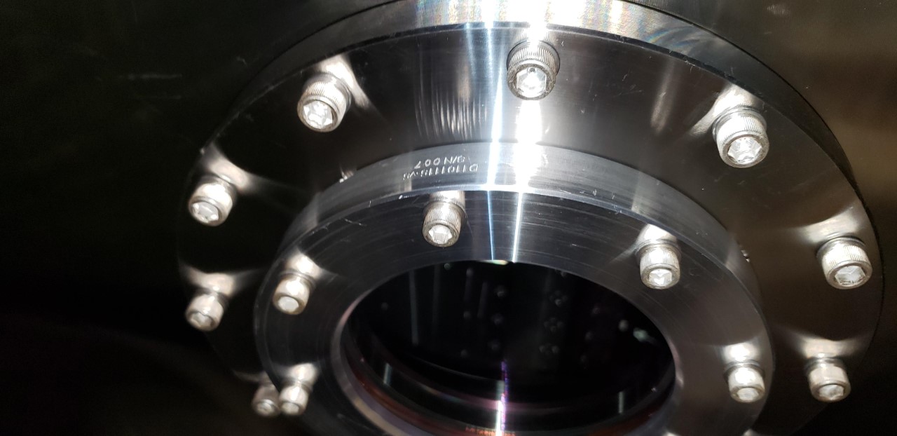 I verified that the viewport assembly does in-fact look to be the expected D1101095 s/n 003 assembly - I could see the D1101005 stamp (but no s/n) on the viewport glass itself, and the VP metal clamp part was labeled D1101115 s/n 007 - all consistent with the ICS assembly records which state the location of Septum Output. The D1101005 stamp on the optic was at the bottom of the barrel, which according to the drawing means the arror (thick part) is on the 3 o'clock position, as previous installation alogs report. Good.