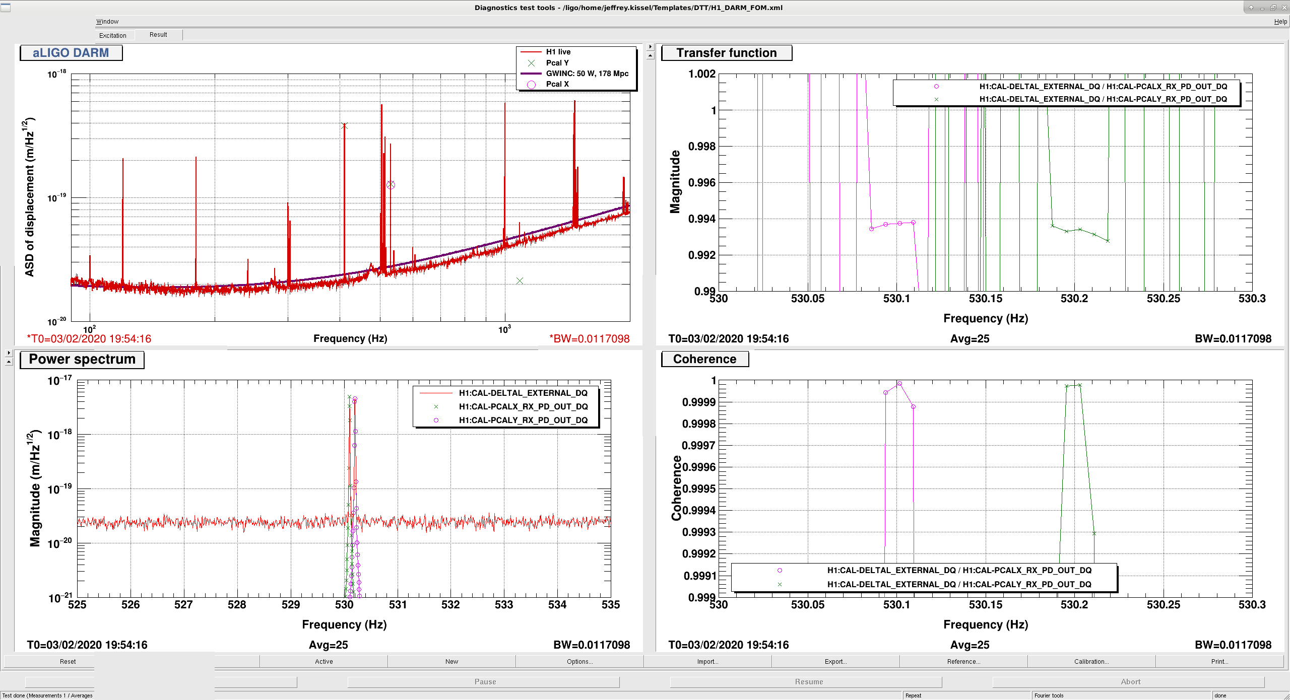 The OBSERVATION READY segment that just started at 2020-02-03 19:53:05 UTC with these lines newly moved. Attached is a screenshot of a 0.01 Hz BW, 25 average ASD and transfer function (75% overlap, Hann window). Even this preliminary result of PCALX / PCALY = PCALX/DELTAL * DELTAL/PCALY = (0.993761)^(-1) * (0.993408) = 0.999644 alone should have uncertainty of unc_X = sqrt((1-C)/2*Navg*C) = sqrt((1.0-0.999985)/(2*25*0.999985)) = 0.000548 = 0.0548% = 5.4 "HOPs" unc_Y = sqrt((1-C)/2*Navg*C) = sqrt((1.0-0.999978)/(2*25*0.999978)) = 0.000663 = 0.0663% = 5.4 "HOPs" total_unc = sqrt(unc_X^2 + unc_Y^2) = 0.000860 = 0.086% = 8.6 HOPs. Note, as usual, this assumes that the value of C/(1+G) at 530.1 Hz and 530.2 Hz doesn't change with respect to each other over the duration of the measurement. This should be sufficiently high above the DARM UGF that C*A*D = G >> 1, and the time dependence of C should be dominated by the change in optical gain and cavity pole frequency. The optical gain change, \kappa_C would be common to both frequencies, so the only concern is with cavity pole, f_cc. These time dependent parameters of C are measured independently with other PCALY line frequencies at 410.3 Hz, and they indicate that f_cc remains between 410 and 414 Hz. If one takes the ratio transfer functions with a pole at 410 Hz, and one at 414 Hz, then evalute that ratio at 530.1 Hz and 530.2 Hz, then magnitude ratio value is (C_410 / C_414)_530.1 Hz = 0.9939656567, (C_410 / C_414)_530.2 Hz = 0.9939647934, and the difference across the two frequencies is at the [[ (C_410 / C_414)_530.1Hz - (C_410 / C_414)_530.2Hz ] / (C_410 / C_414)_530.1Hz] = 8.68e-07 = 8.68e-5% level. Further detailed analysis will likely support the same conclusion with this preliminary result: there is "no" residual systematic error between the PCALs at this frequency, at this time.