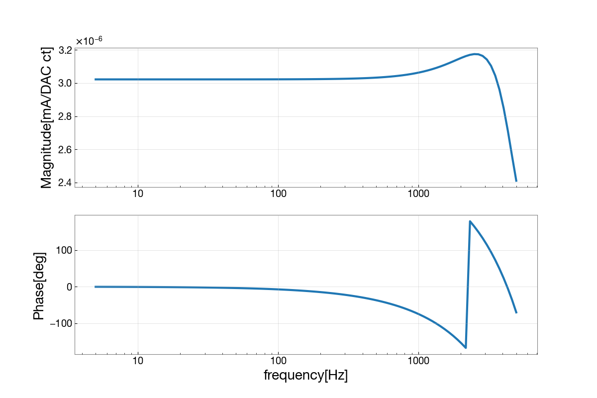 The gain of this model in 1 kHz is ~3.06e-6 [mA / DAC ct] in tf.png.