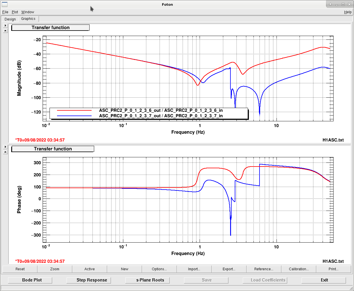 Previous alogs (64350 and 64139) we noted some ring ups in PRC2 pitch during lock acquisition. I adjusted the PRC2 P loop shape to further supress 1 and 3 Hz oscillations that show up due to the plant resonances. I updated the FM8 filter to be a modified plant inversion that also has an ELP at 2.5 Hz. "Modified" plant inversion in that we still are suppressing the 1.1 Hz peak with a pair of complex zeros but the low pass takes care of the ~3 Hz peak. In the attachment, the blue trace shows the new filter design, while the red trace is the old filter design. The new filter reduces the phase at the UGF (0.1 Hz), by 4 degrees, but the phase margin was ~65 degrees, so that shouldn't cause a problem. See the PRC2 P measurement in userapps asc/h1/templates/PRC2 for reference.