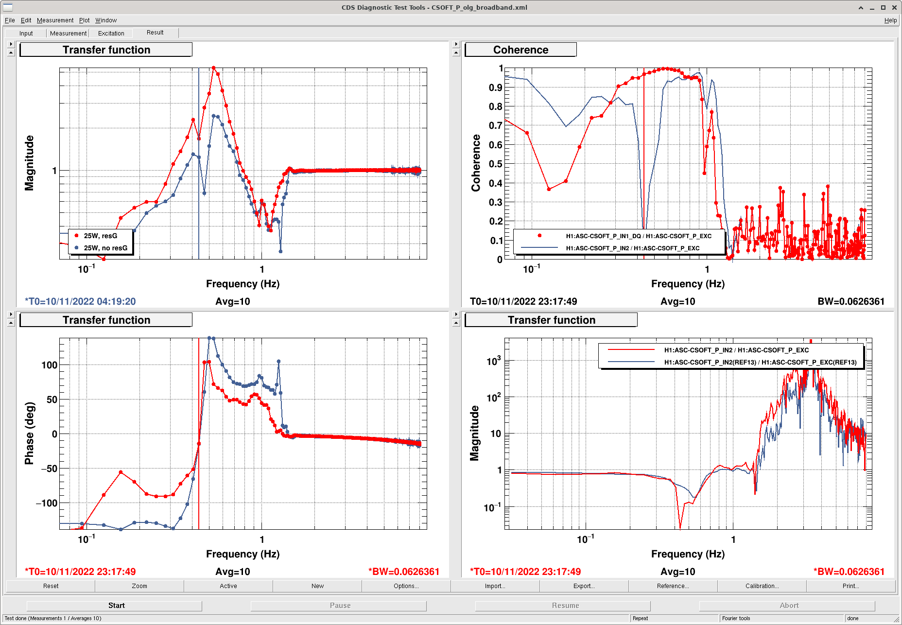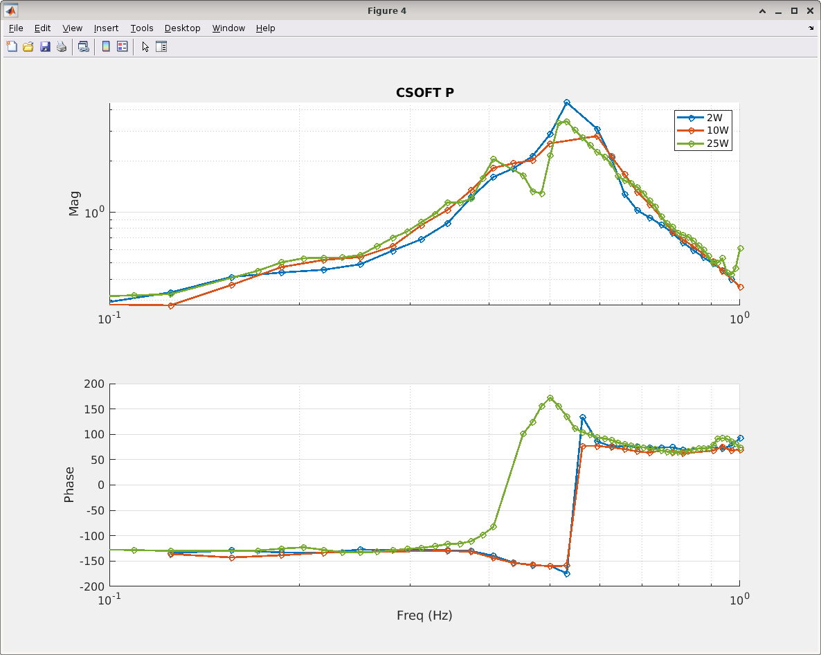 You can see a plot of our CSOFT p measurement, where I have plotted only the regions where the measured had high coherence. As we power up to 25 W, a feature appears near 0.4 Hz where the gain drops, and the phase crosses zero. Evan and I have slightly different ideas about what this could be, a mechanical resonance, or possibly radiation pressure effects? Either way, this might be what is preventing us from powering up. Sheila and I think that a best short term move might be to increase the CSOFT P gain.