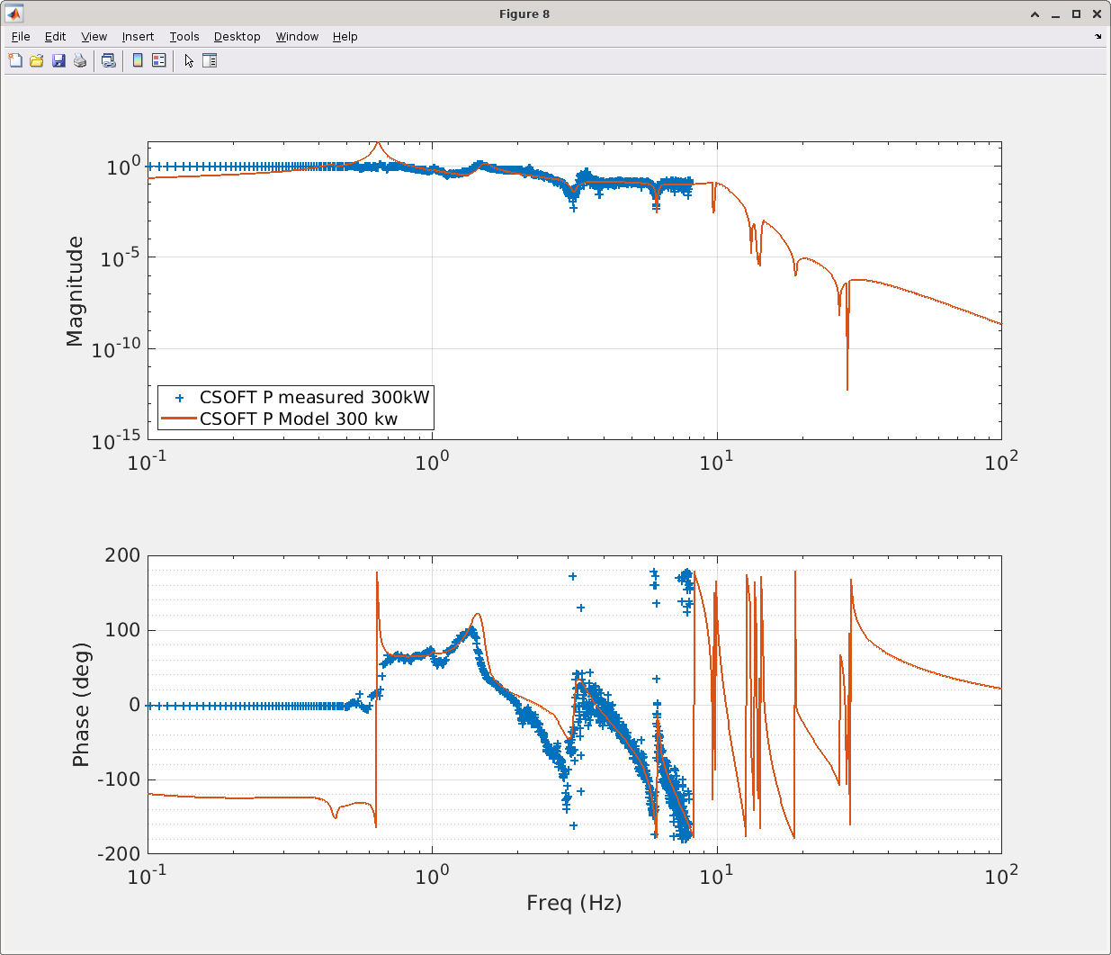 Also worth noting is that in the past we have also had 3.3 Hz ringing in CSOFT pitch, however the ring up is much slower. It does not prevent us from power up, but it does prevent us from sitting at high power without moving to our lownoise state. I have attached a plot of a previous higher frequency CSOFT P measurement, compared with a CSOFT pitch model that I have made (model in orange, measurement in blue). There is another feature around 3.3 Hz that could contribute to this instability. Raising the gain might make this feature worse, so we would need to think about how to approach updating CSOFT pitch to avoid both the 0.5 Hz problem and the 3.3 Hz problem.