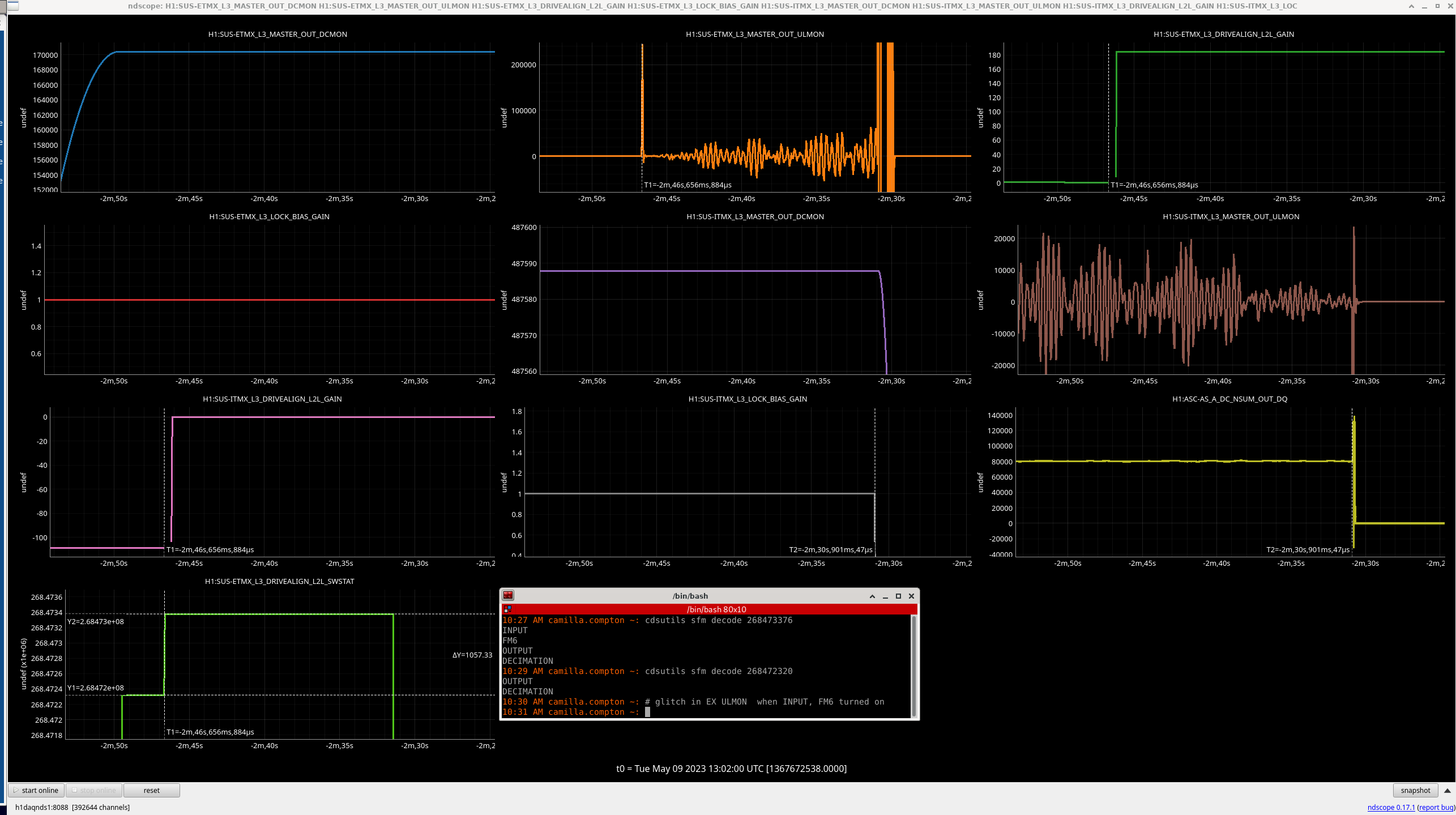 There was a glitch in ETMX int he last state of ESD_EXC_ETMX when the L2L filters were changed even though the L2L gain was zero, see attached. This seems strange. After this point, the ADS monitors show an excursion (12:59 UTC lockloss) which could have caused the lockloss. ( <- Elenna clarfifed that the ADS control signals don't show anything when the lines are off...d'oh. )