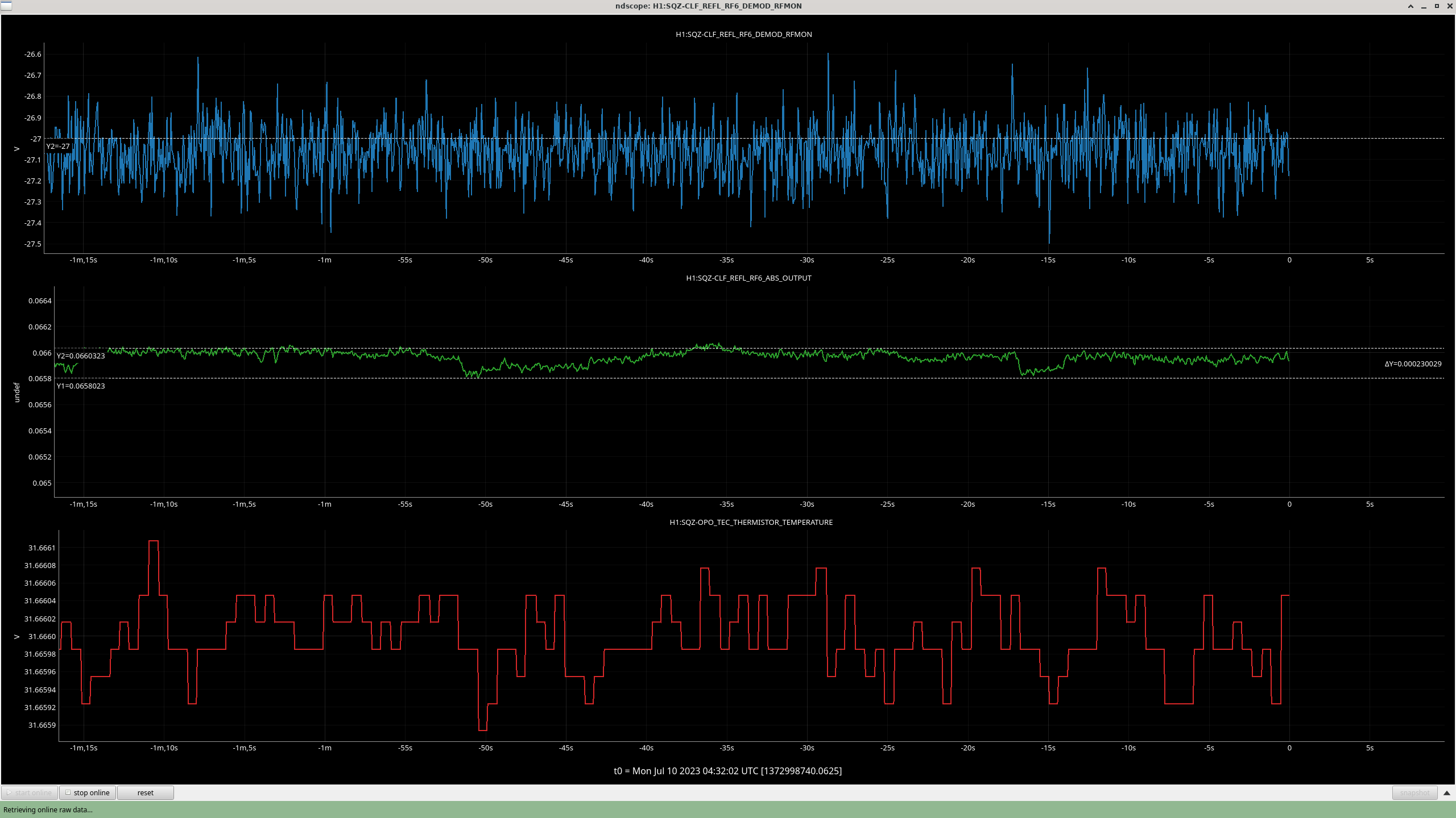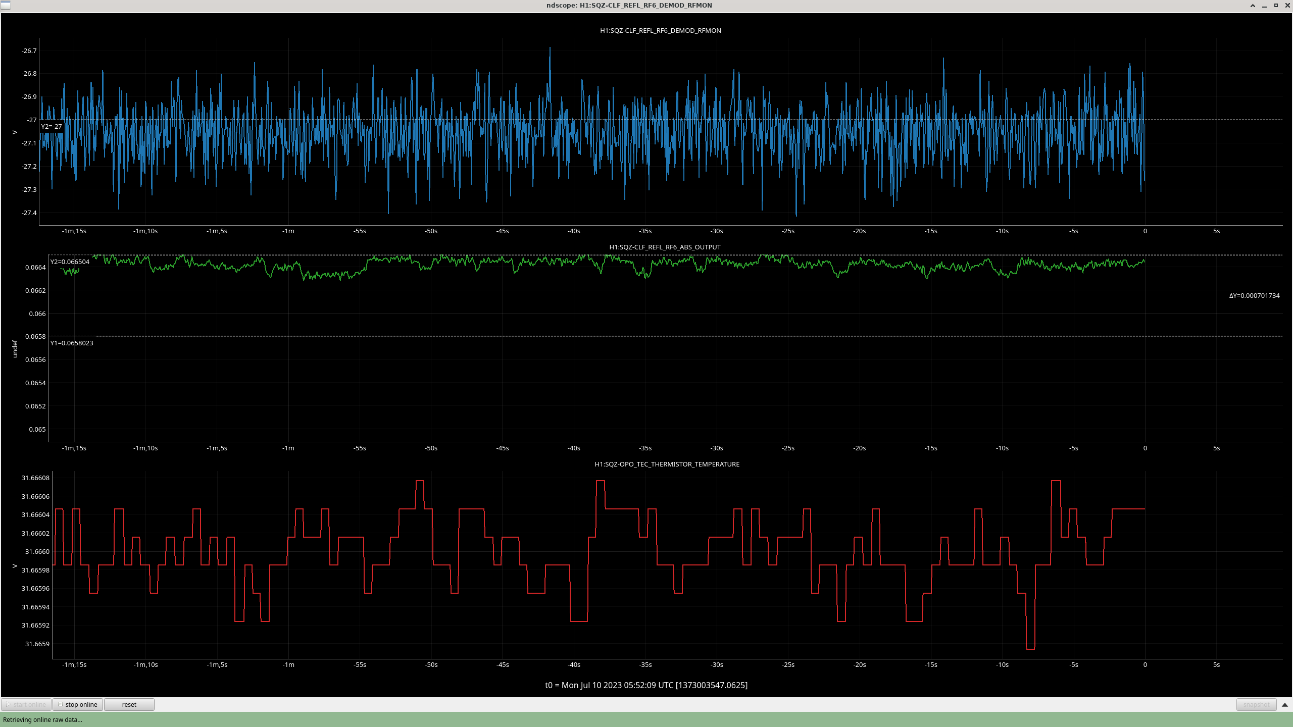 - I tweaked the SQZ OPO Temp per Vicky's request during the long OMC Whitening phase. The values of the temperature were changed to maximize the green trace as per step 3 of the instructions in alog 70050. Both screenshots demonstrate the change in the green trace. The first (1) is right after the change and the second (2) is while in NLN Observing. The overall improvement was from ~0.0658 to 0.0666. The SDF difference this temperature change induced was accepted in order to move to observing.