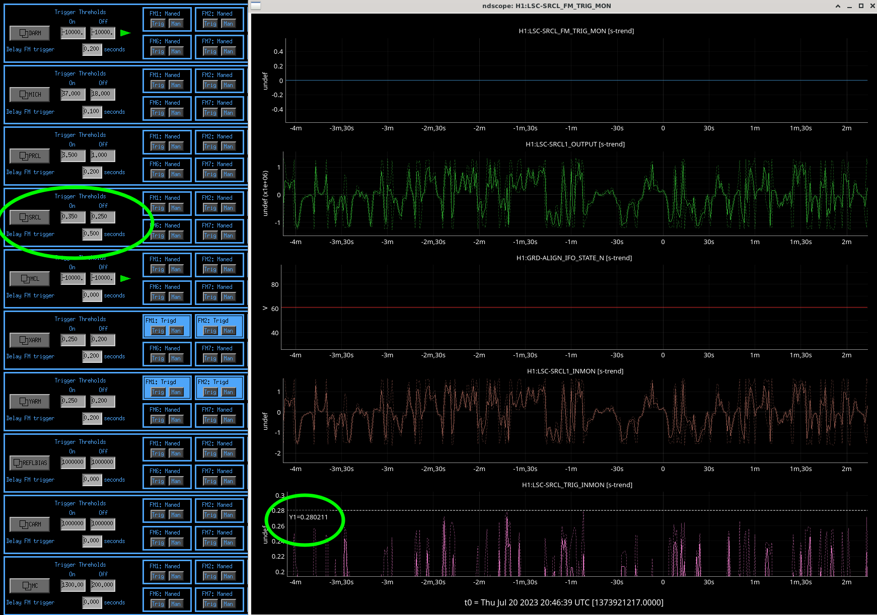 The SRC alignment step of initial alignment has been failing for the last 8 days and a for more days before that. The SR2 alignment step will run, then an operator will move SRM to increase ASC-AS_A peaks and make the AS air camera spot better. Even though these have all looked good recently, it hasn't been enough to get the trigger thresholds for SRCL high enough for it to lock. Operators have been skipping this step without problems, so alignment must be at least passable.