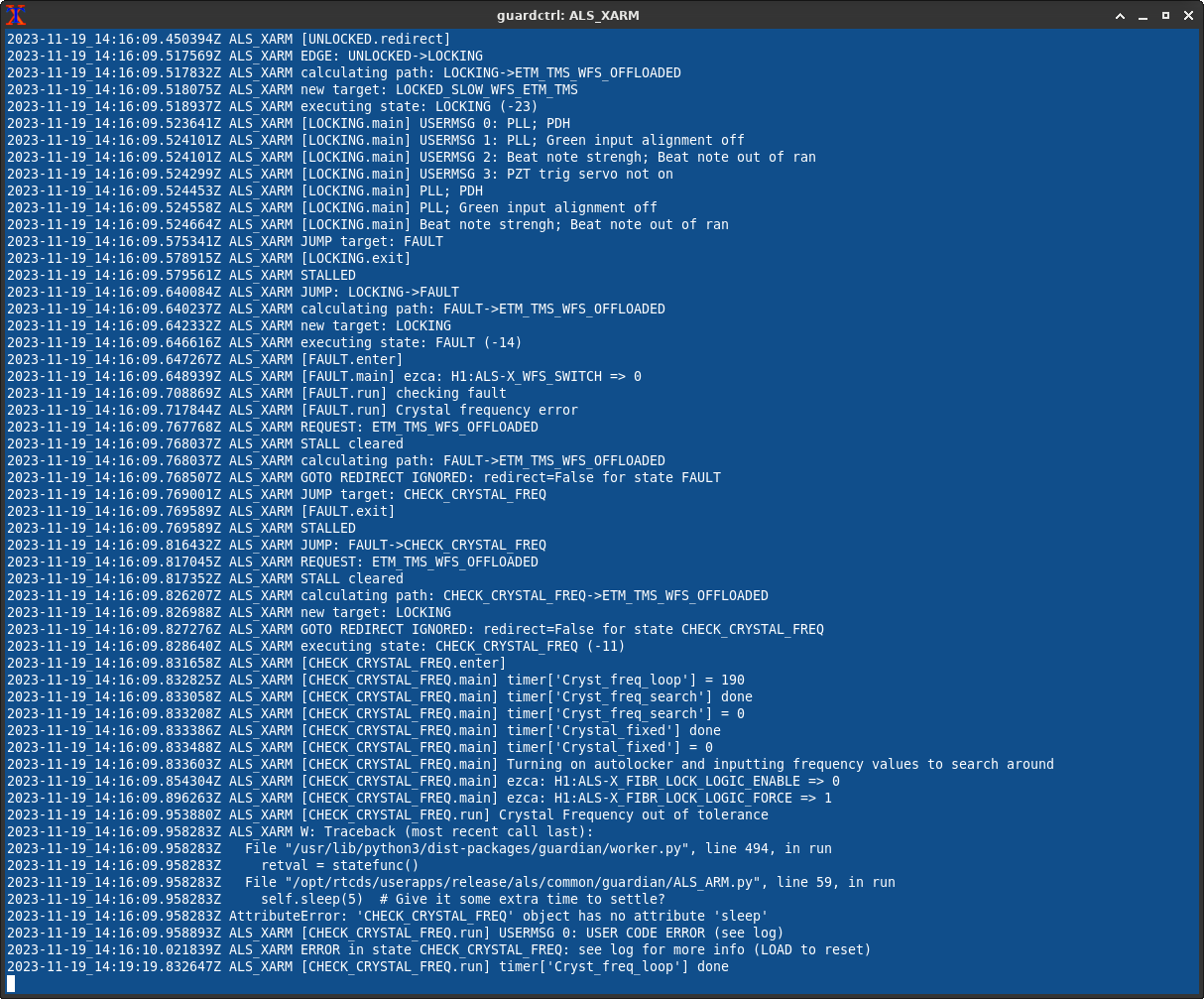 ALS X arm guardian went into error in relocking when it went into the CHECK CRYSTAL FREQ state during LOCKING ARMS GREEN. Attached is the screenshot of the guardian log. I reset the ALS X ARM guardian and tried relocking x, which looks to have solved the issue. ISC is now continuing back up.