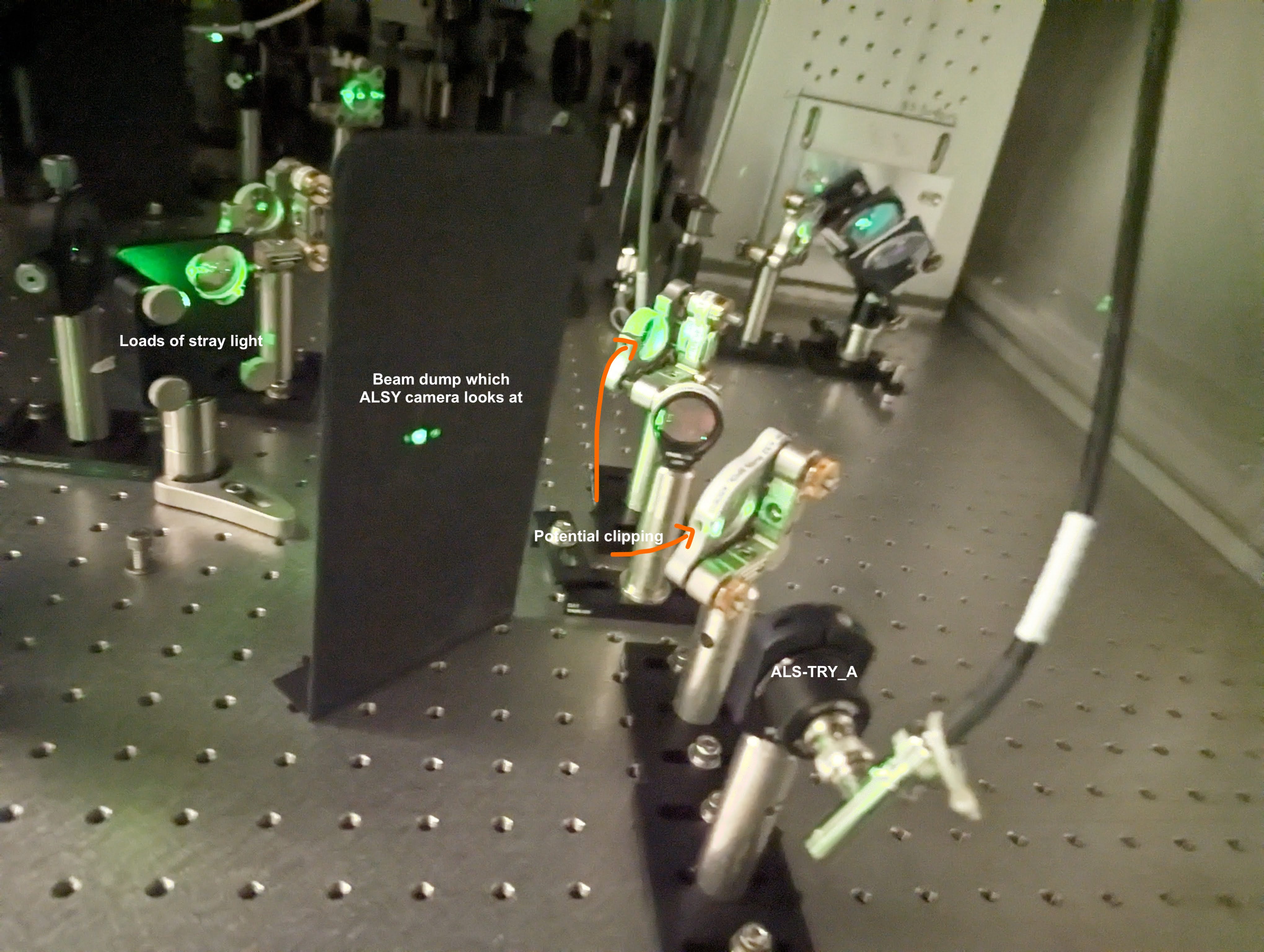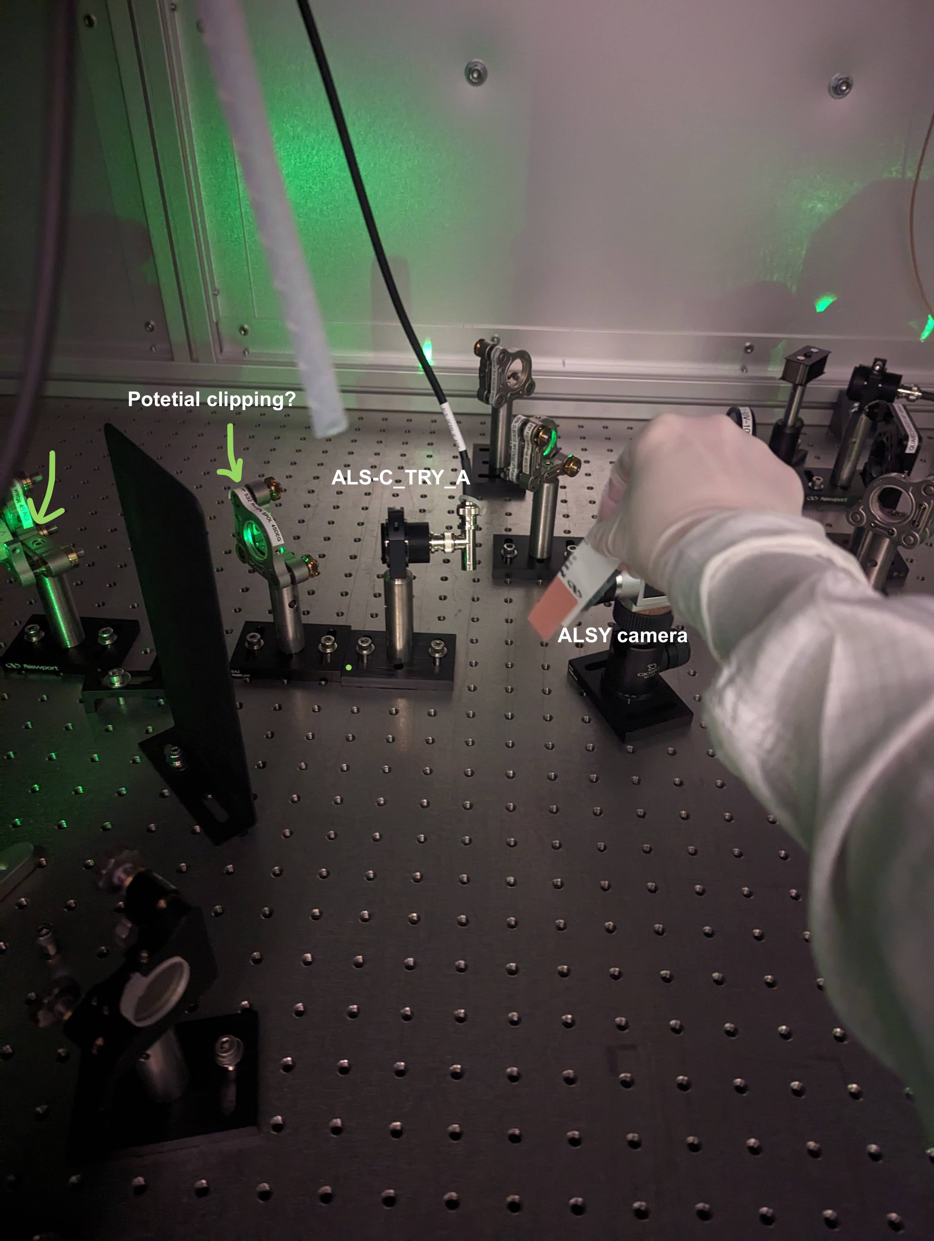 This morning we went to ISCT1 with the goal of touching up the ALS DIFF beat note (currently sitting at around -13dBm), and investigating the clipping on the ALS Y transmission path, since there visible clipping on the ALSY camera and low-ish transmitted power on ALS-C_TRY.