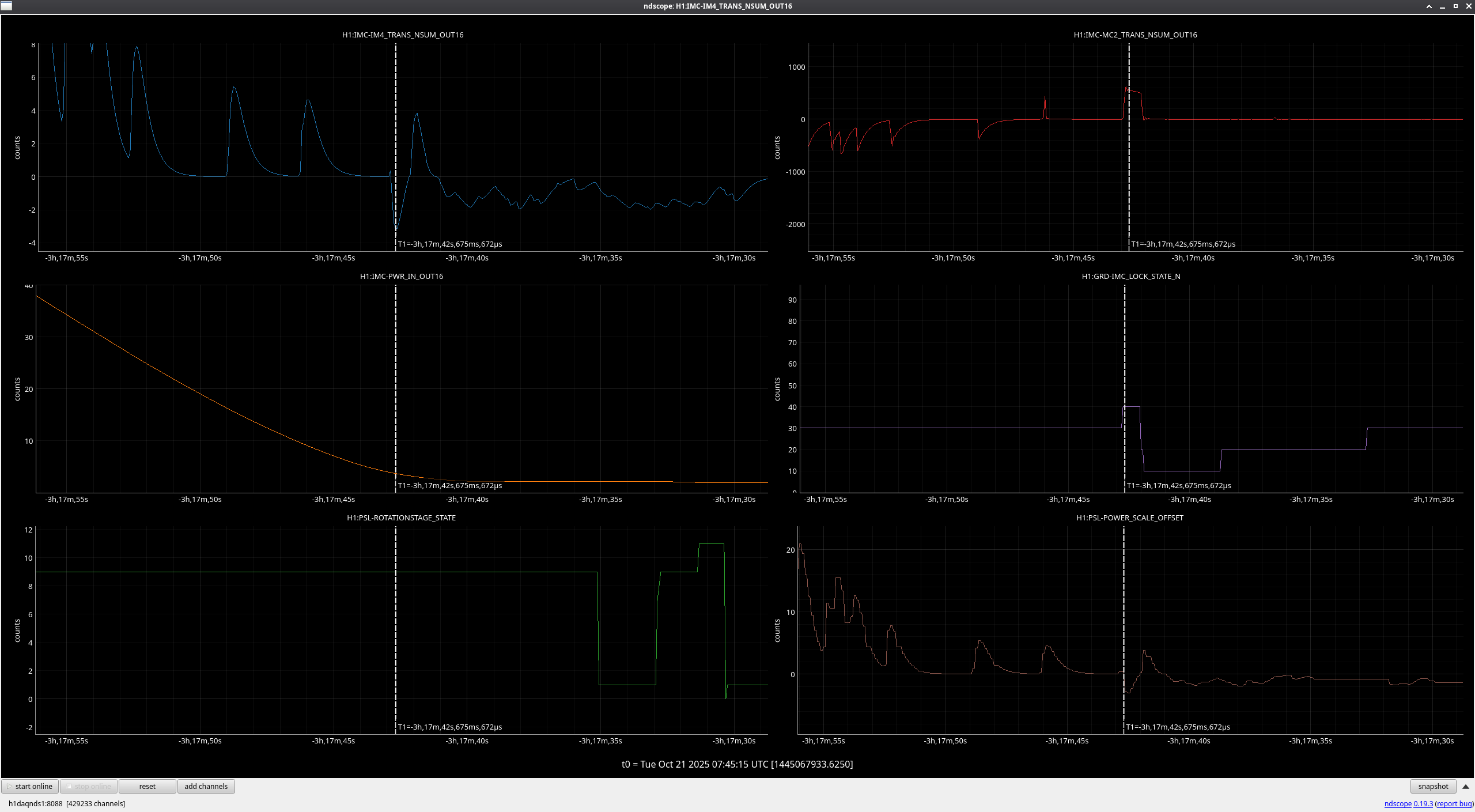 While we were describing the issue to Keita and starting to look into where a sign flip could have happened, Ryan noticed that the power scaling was at -1.4. Since this should just scale with the IFO input power, it shouldn't ever be negative. I plugged in 2.0 and, then everything looked normal again. Looking at the last attachment, IM4 trans goes negative when we lost lock and powered down. The power scaling adjusted as such, and stopped adjusting when the rotation stage stopped moving, as it was supposed to do. If we want to use this channel, we'll have to add some logic to avoid this.