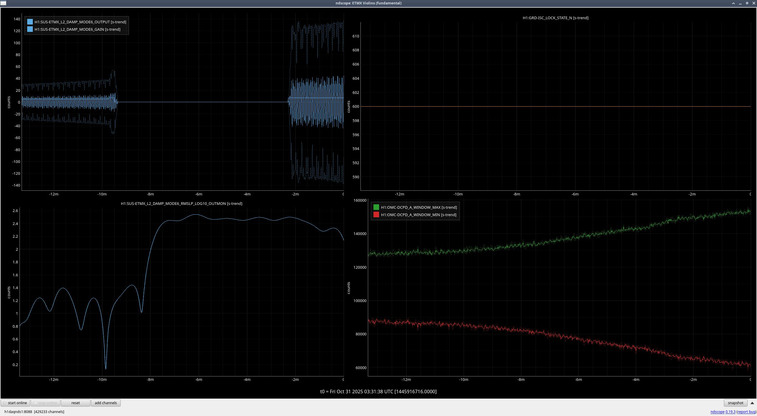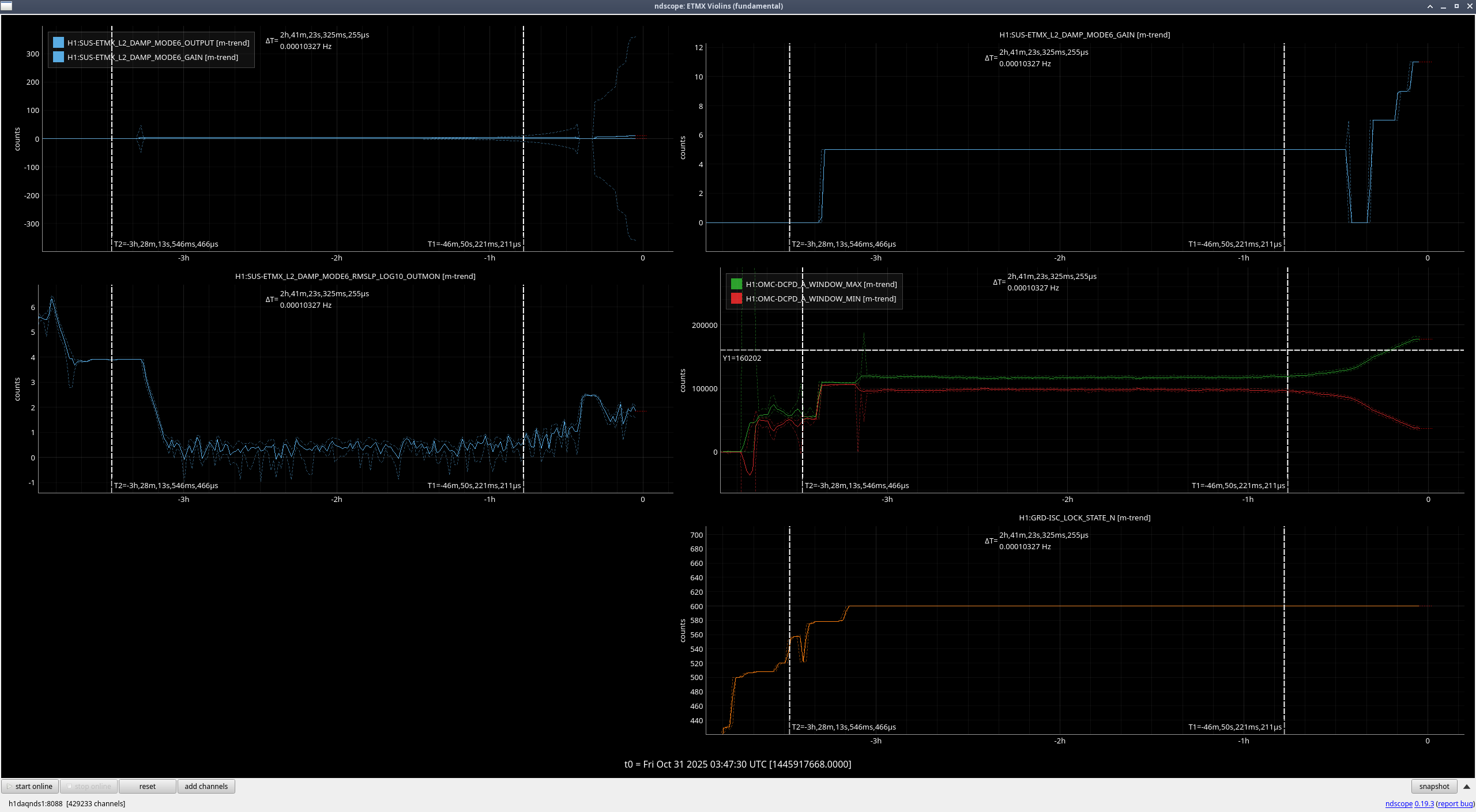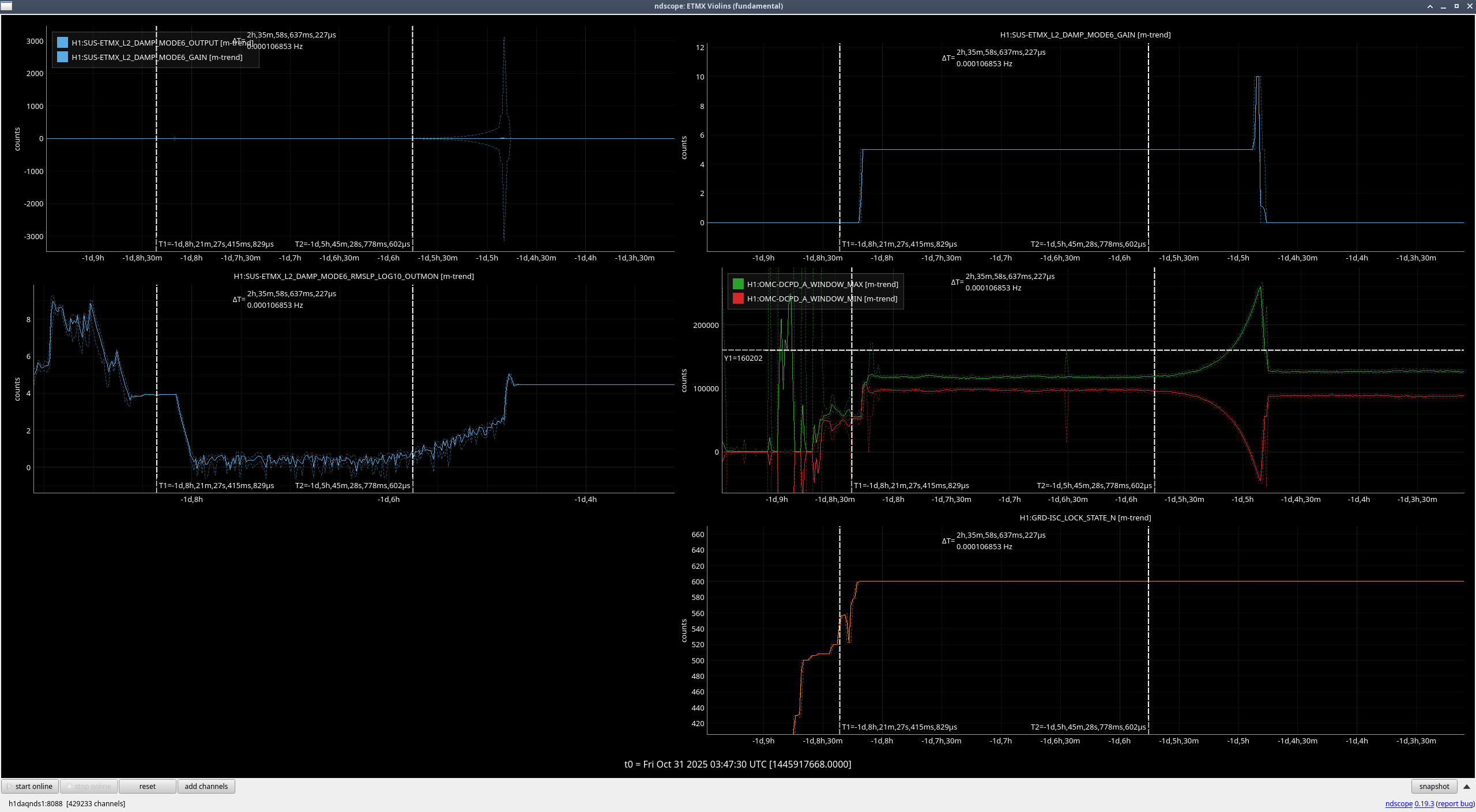 Observing at 150 Mpc and have been Locked for almost 3 hours. About 2.5 hours into the lock I noticed that the DCPDs were diverging. Since this happened yesterday (87842) and had been due to violin mode ETMX mode 6, I first turned the damping off for that mode since yesterday trying to damp the mode more made it ring up more (but also brought the DCPDs back together??). This clearly didn't help since the DCPDs started diverging at a faster rate, so I've slowly been upping the gain from its nominal gain of 5, to now 11, which seems to be damping it. I'll probably bump the gain up a bit more to get the DCPDs to start converging.