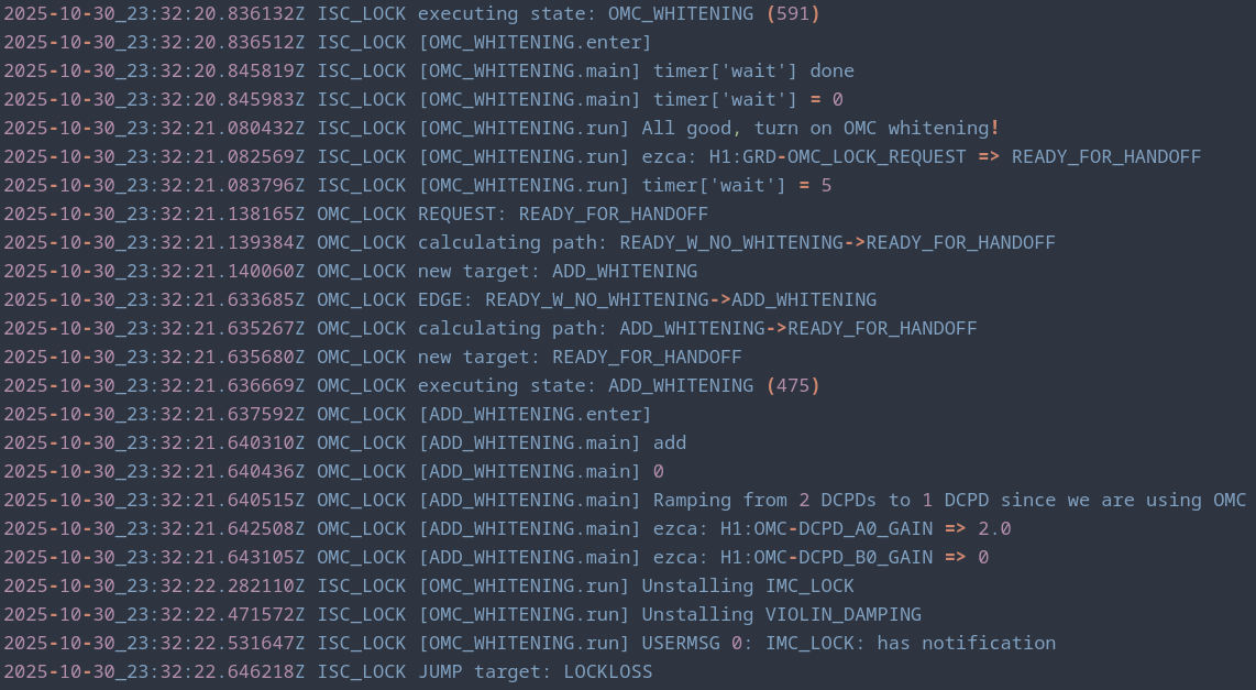 As expected, the time from finishing the MAX_POWER state to when the DCPDs visibly start diverging yesterday's lock vs today's is about the same, 2hr 37mins-ish (yesterday's lock, this lock)