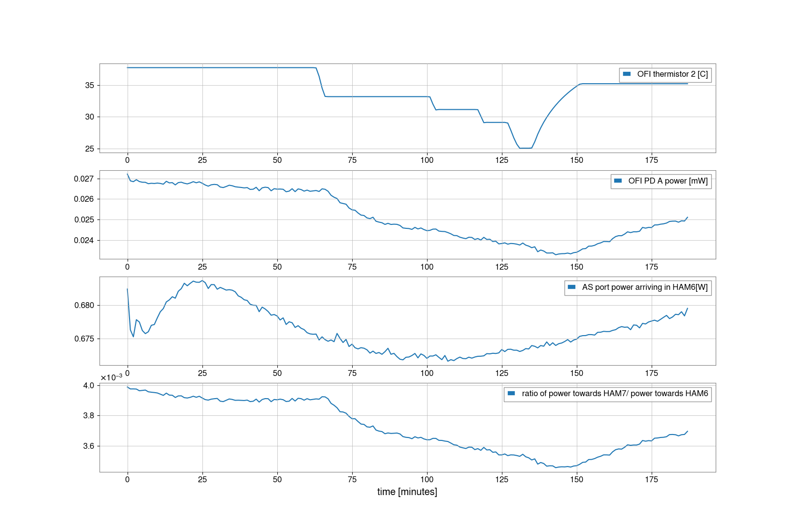 I changed the OFI temperature slowly while Robert and Matt were doing other commissoning. We had only been locked for a bit over an hour when I started, so there is still some thermalization causing a downward drift in AS power, the steps related to OFI temp seem large enough to distinguish.