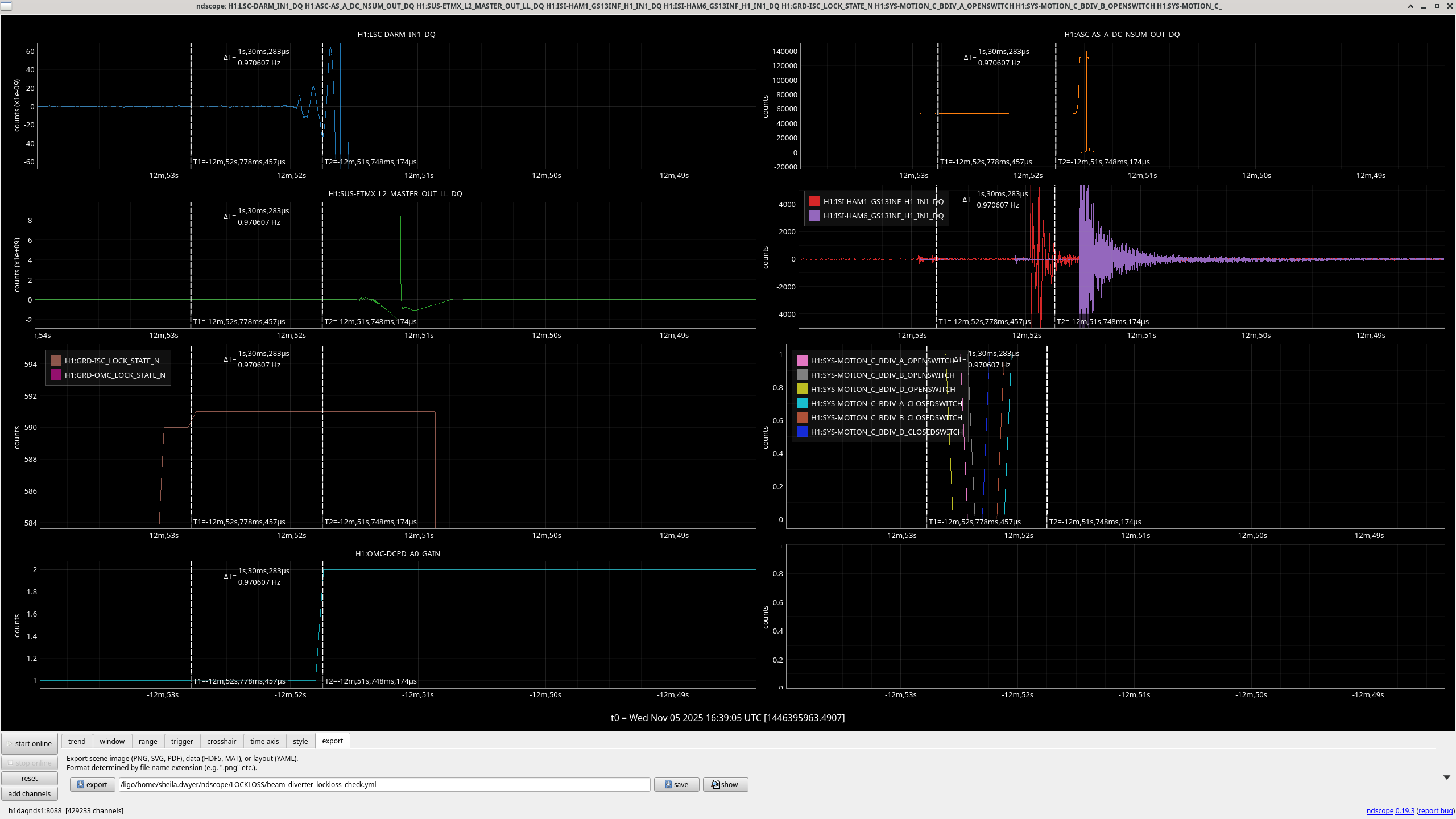 In the attached screenshot the first time cursor shows when the CLOSE_BEAM_DIVERTERS guardian state ends and the guardian moves on to switching the OMC whitening state, the HAM1 ISI is still shaking from the beam diverters when the OMC DCPD gains are changed. I've saved this template as sheila.dwyer/ndscope/LOCKLOSS/beam_diverter_lockloss_check.yml