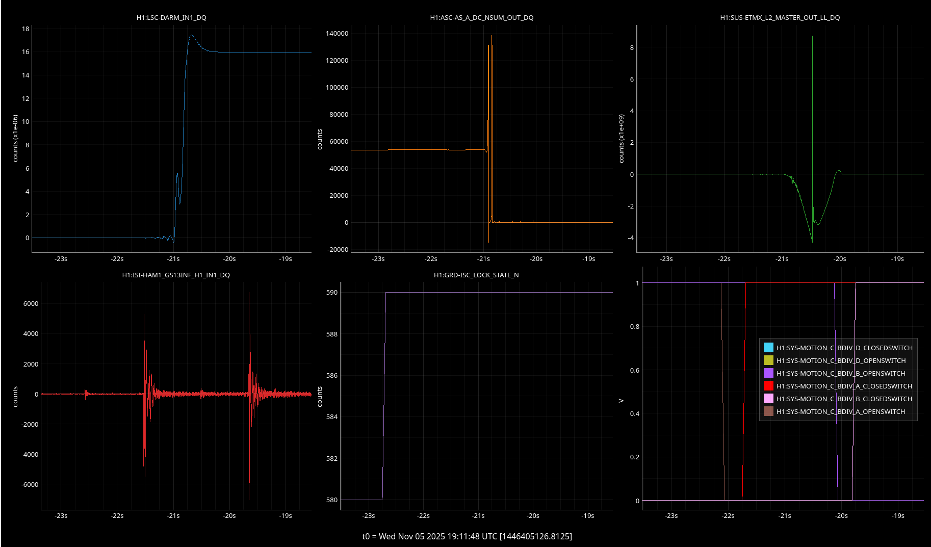 Looking at the HAM6 beam diverter, it only has a small (500 counts) kick after the beam diverter closed. Jim tells us that H1 is on the +y -x side of the ISI, so close to the REFL and POP beam diverter in HAM6.