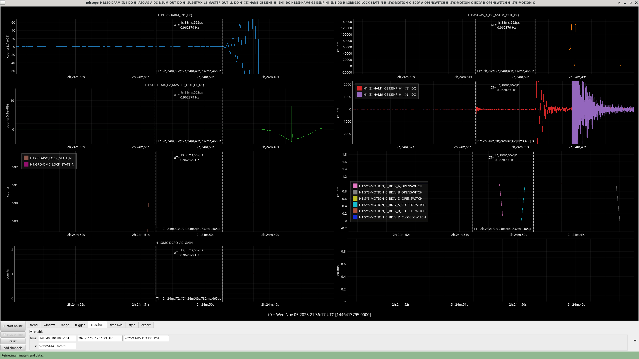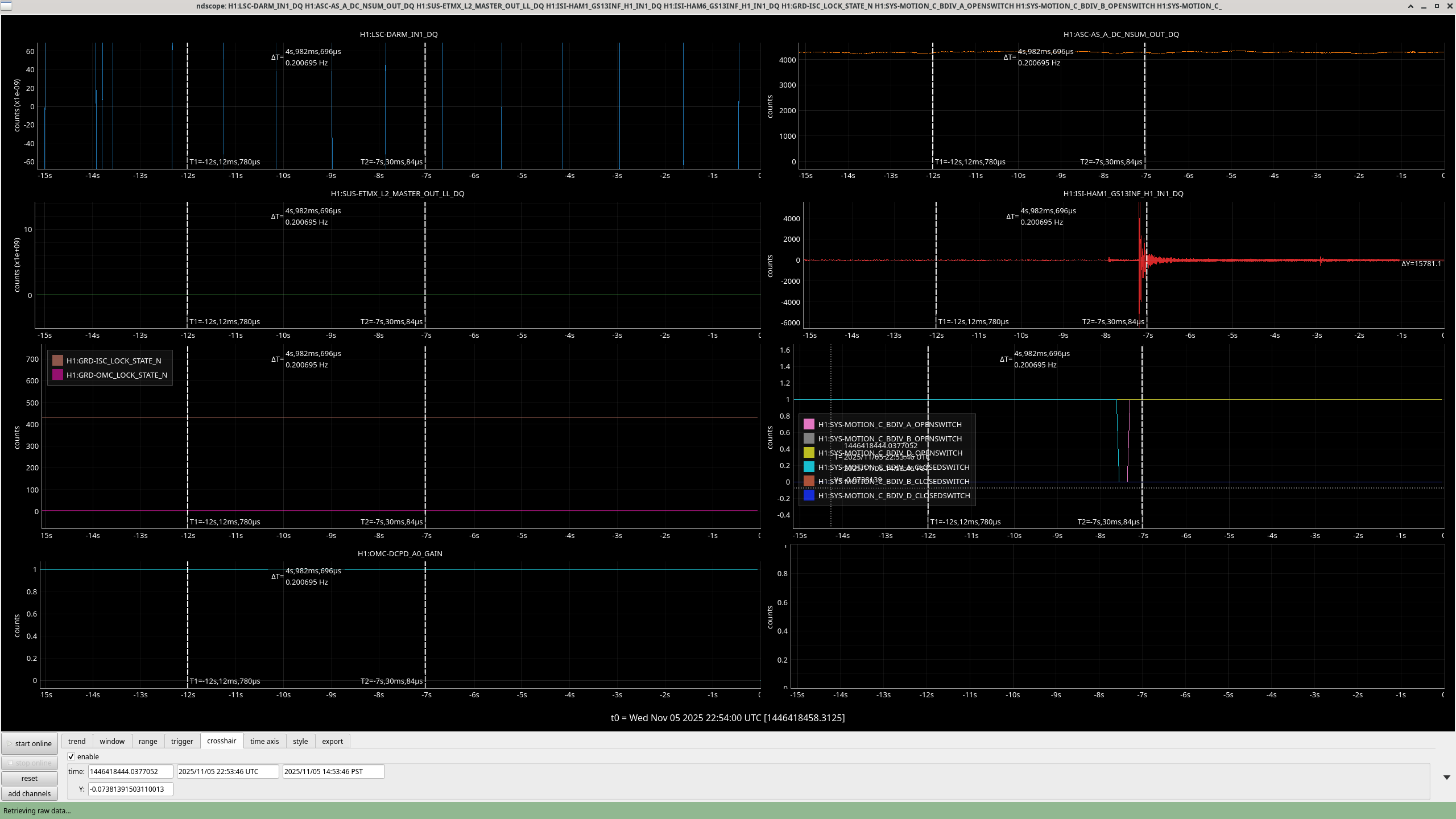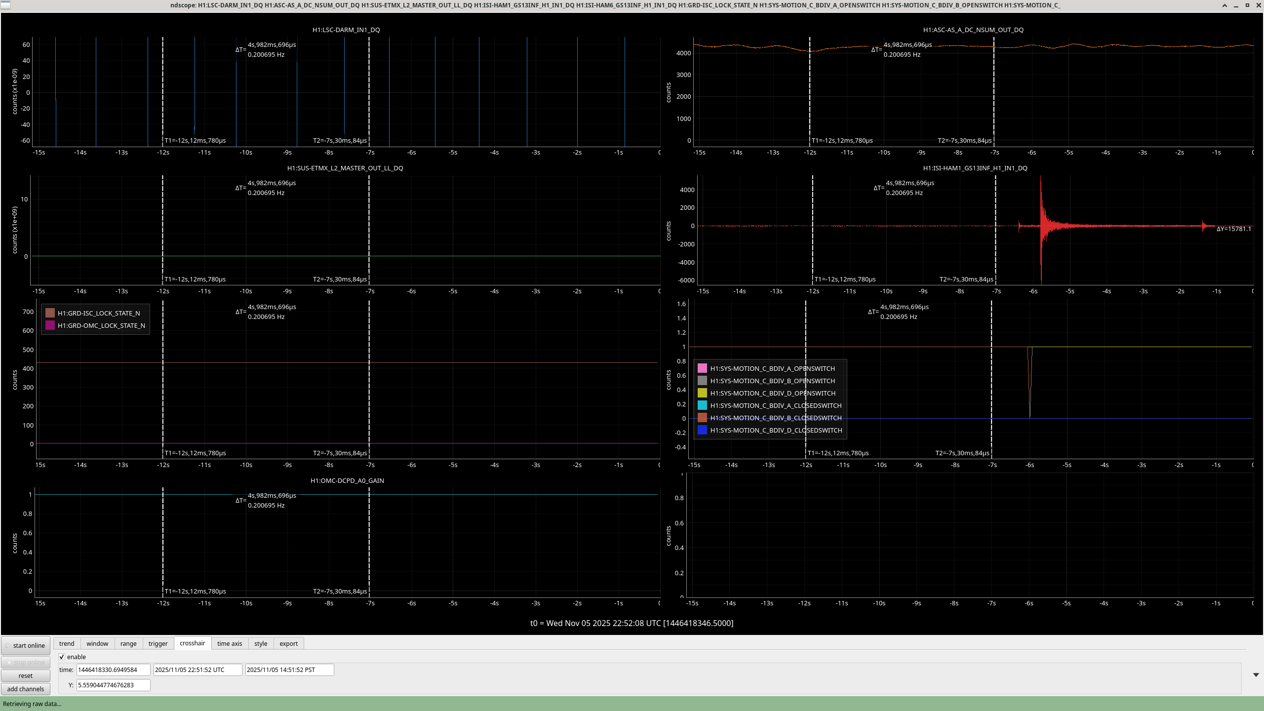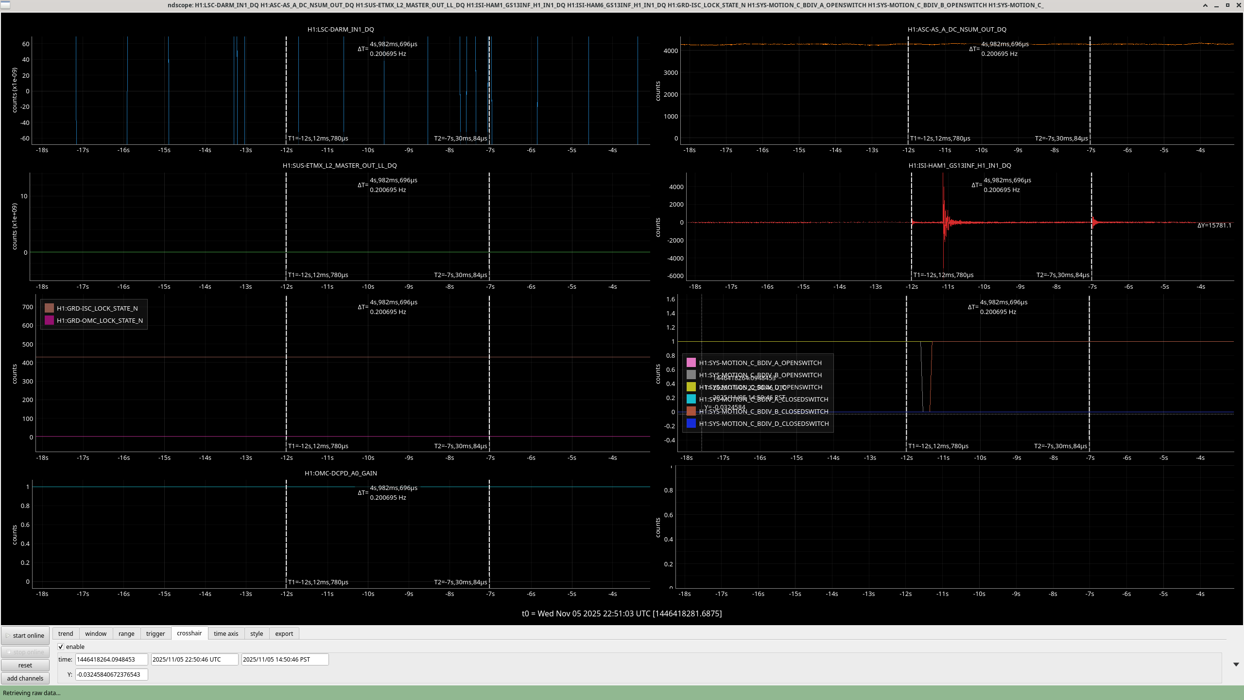 There is a small signal in the GS13 (500 counts on H1 INF) when the beam diverter starts moving, about 0.3 seconds before the open switch turns false. Then the large kick (6000 counts) happens 0.3 seconds after the close switch shows that the beam diverter is closed.