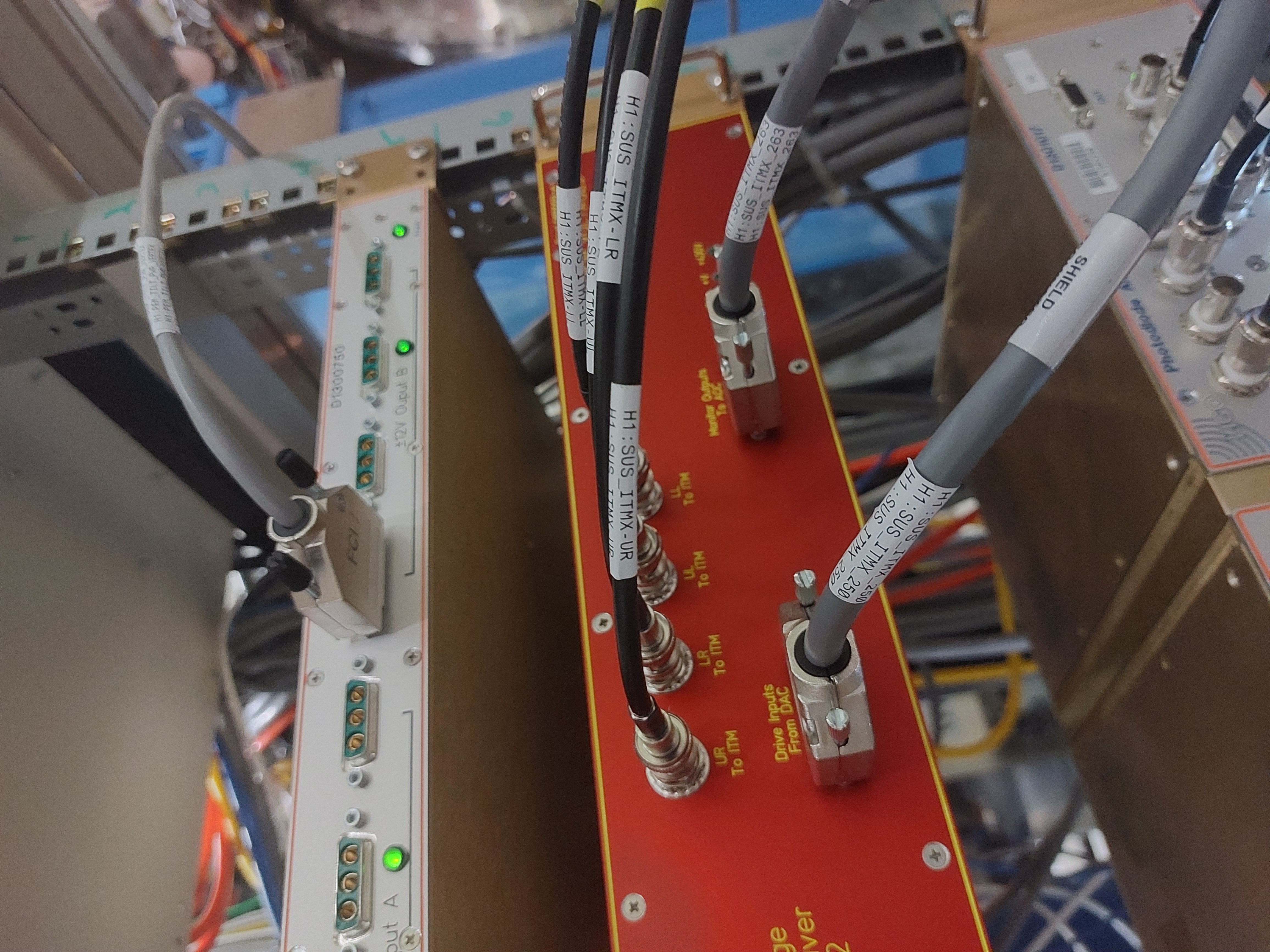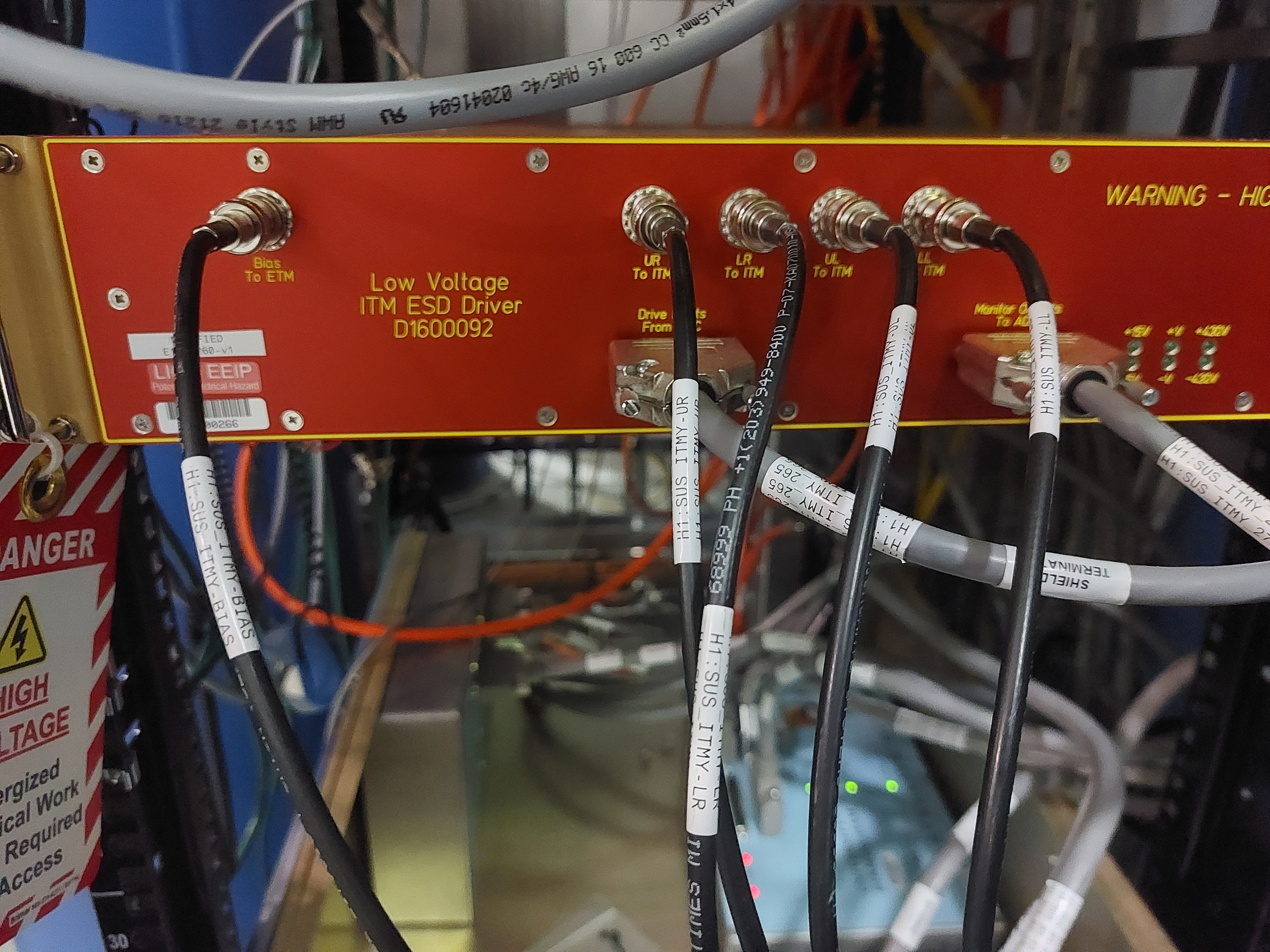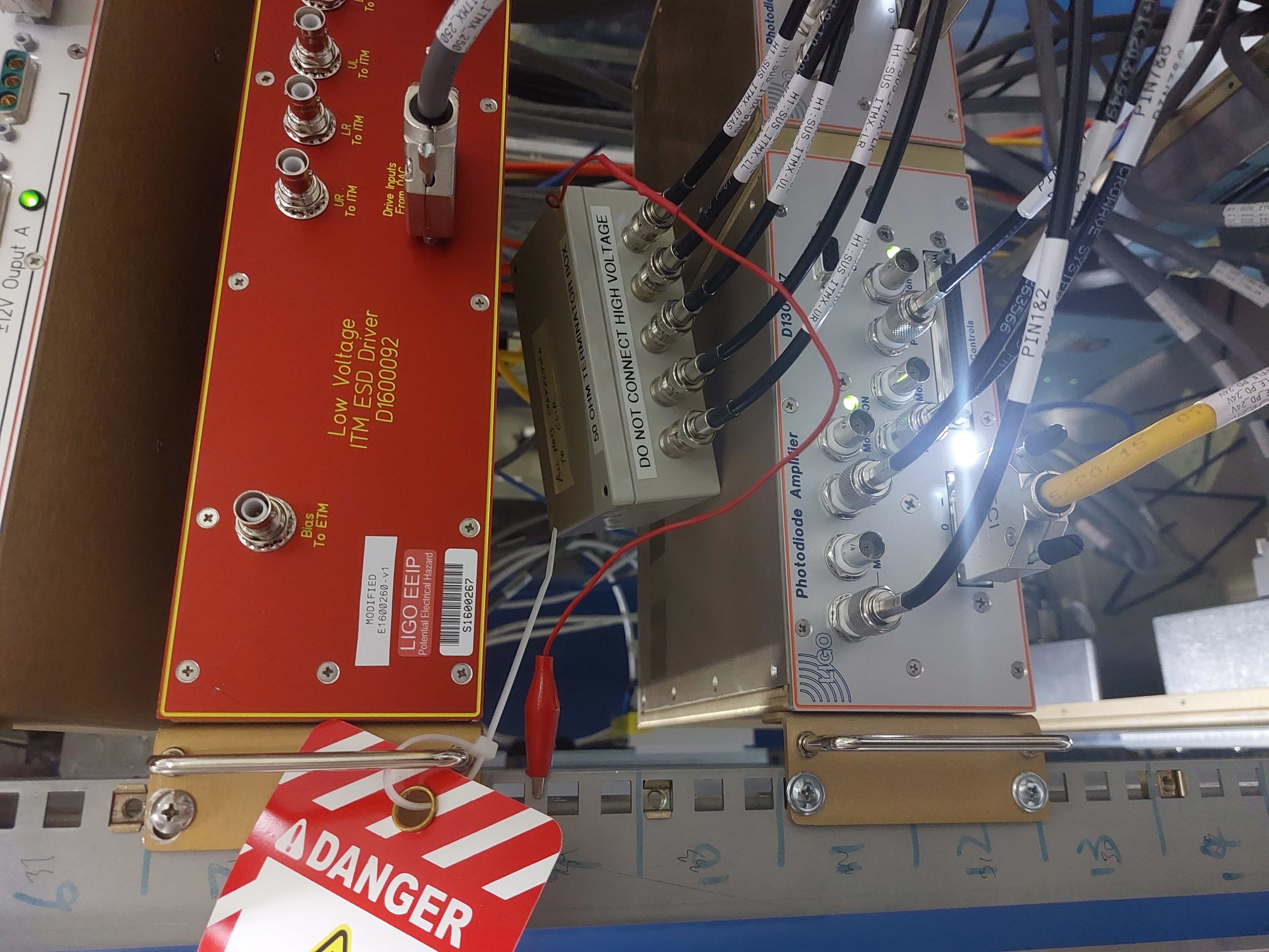 [Joan-Rene Merou, Alicia Calafat, Sheila Dwyer, Jenne Driggers] We have entered the LVEA and went to the Beer garden. There, we first turned off the Low Voltage ITM ESD Driver D1600092, first the 15V switch and then the medium voltage switch. In order to turn it on again, it should be reconnected in the opposite order. With the voltage request set to 0 and chassis powered off, we have unplugged the SHV cables going to the chamber and plugged into Robert's ground boxes, which we used to ground to the rack which is grounded to the chamber. This has been done at both drivers (See attached photos). Afterwards, we have changed the code at /opt/rtcds/userapps/release/isc/h1/guardian/ISC_LOCK.py in order that the LOWNOISE_COIL_DRIVERS will go to LOWNOISE_ESD_ETMY instead of TRANSITION_FROM_ETMX. This has been done by changing lines 6670 and 6674, moving the ", 15" step from line 6670 to 6674. Finally, we communicated the change to the operator and loaded the guardian.