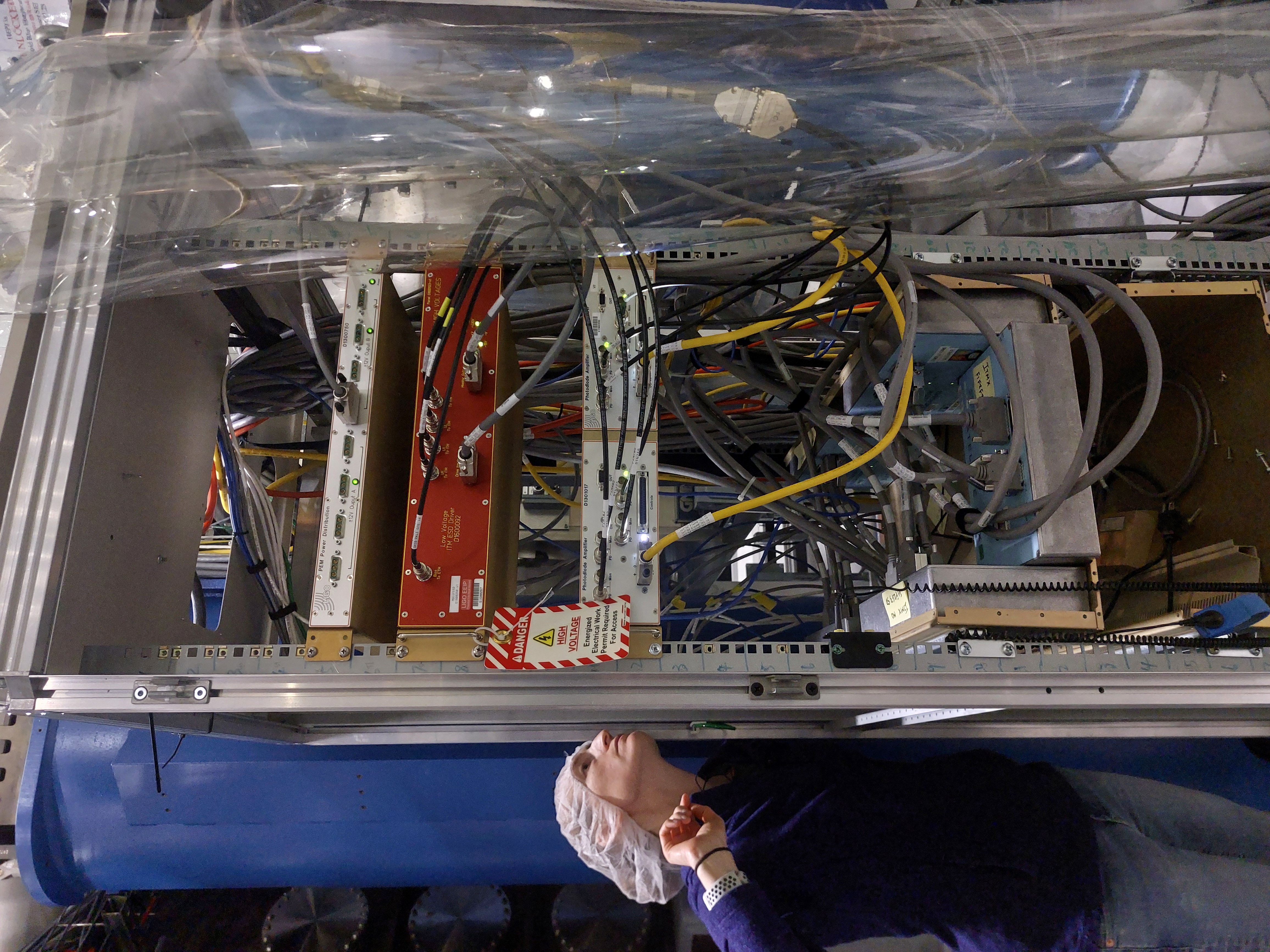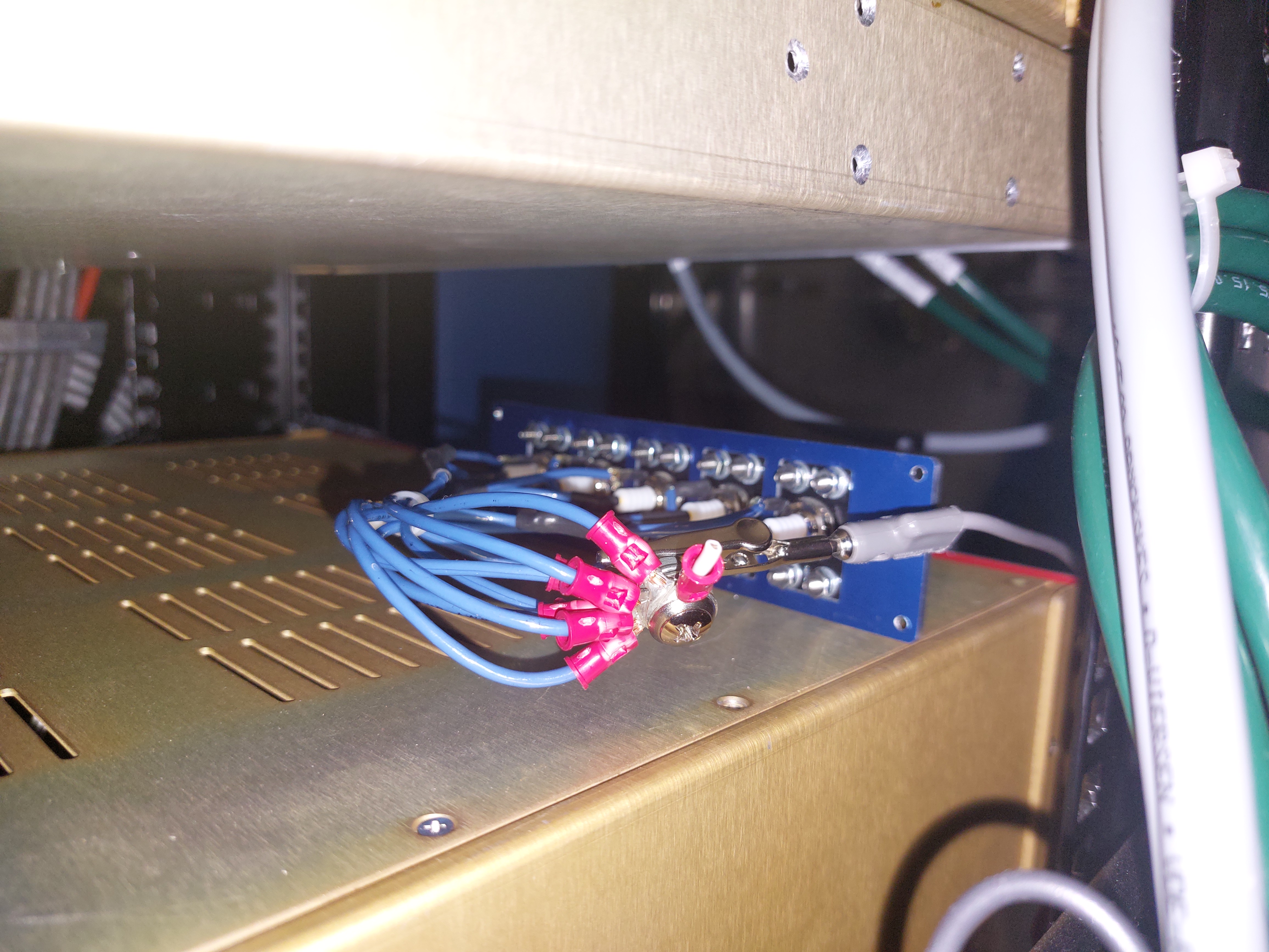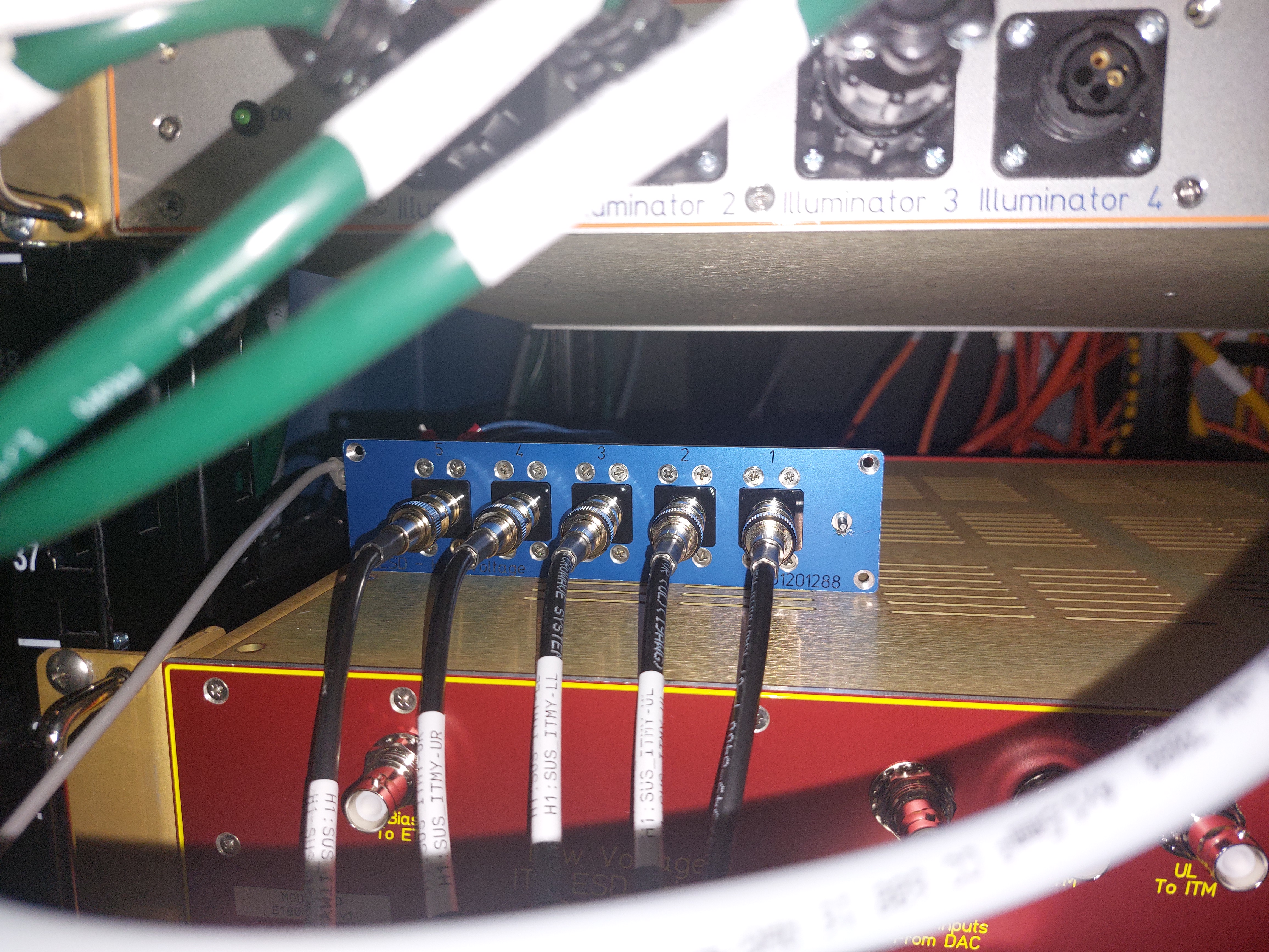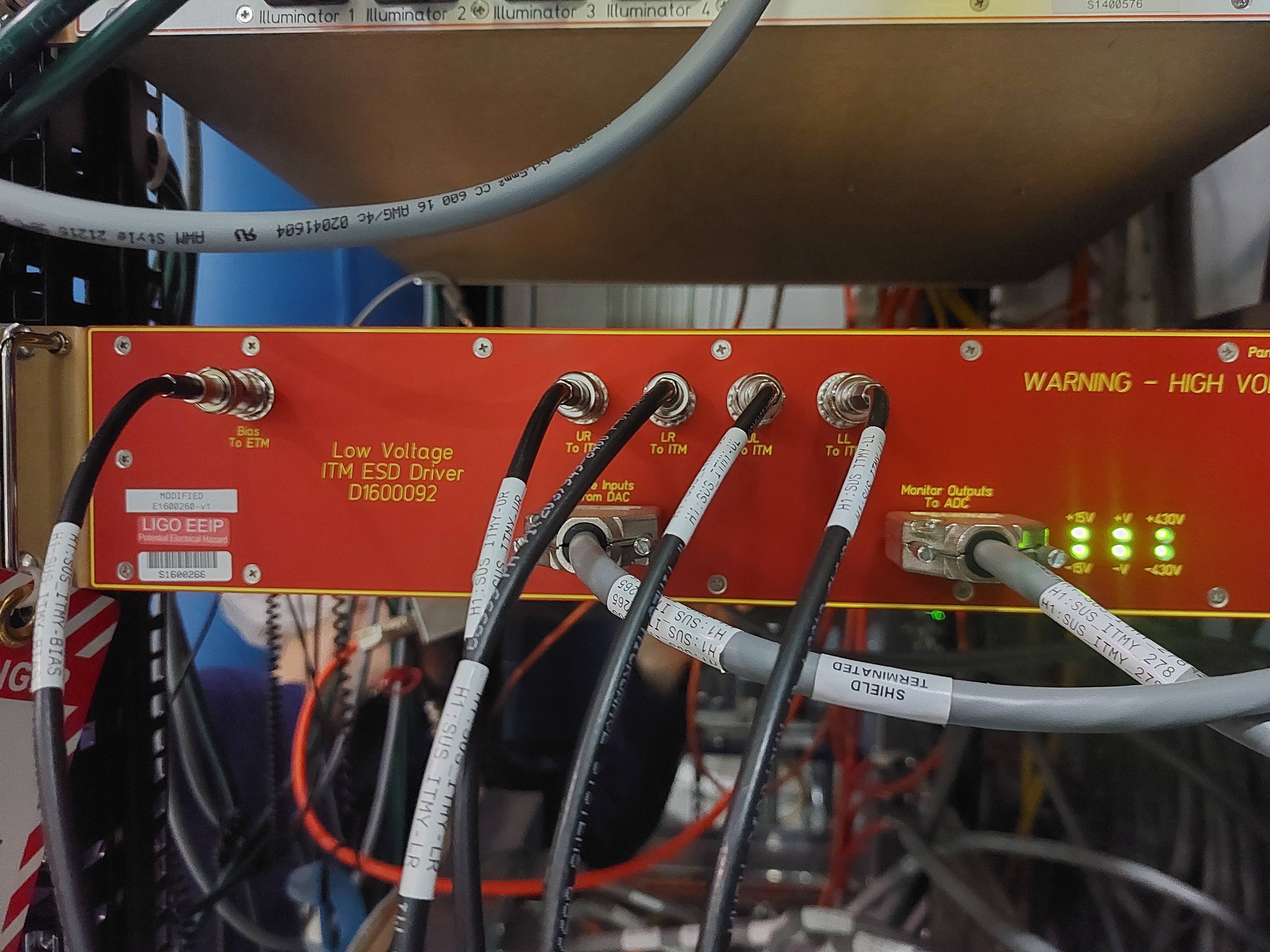 [Joan-Rene Merou, Alicia Calafat, Sheila Dwyer, Jenne Driggers] We have entered the LVEA and went to the Beer garden. There, we first turned off the Low Voltage ITM ESD Driver D1600092, first the 15V switch and then the medium voltage switch. In order to turn it on again, it should be reconnected in the opposite order. With the voltage request set to 0 and chassis powered off, we have unplugged the SHV cables going to the chamber and plugged into Robert's ground boxes, which we used to ground to the rack which is grounded to the chamber. This has been done at both drivers (See attached photos). Afterwards, we have changed the code at /opt/rtcds/userapps/release/isc/h1/guardian/ISC_LOCK.py in order that the LOWNOISE_COIL_DRIVERS will go to LOWNOISE_ESD_ETMY instead of TRANSITION_FROM_ETMX. This has been done by changing lines 6670 and 6674, moving the ", 15" step from line 6670 to 6674. Finally, we communicated the change to the operator and loaded the guardian.