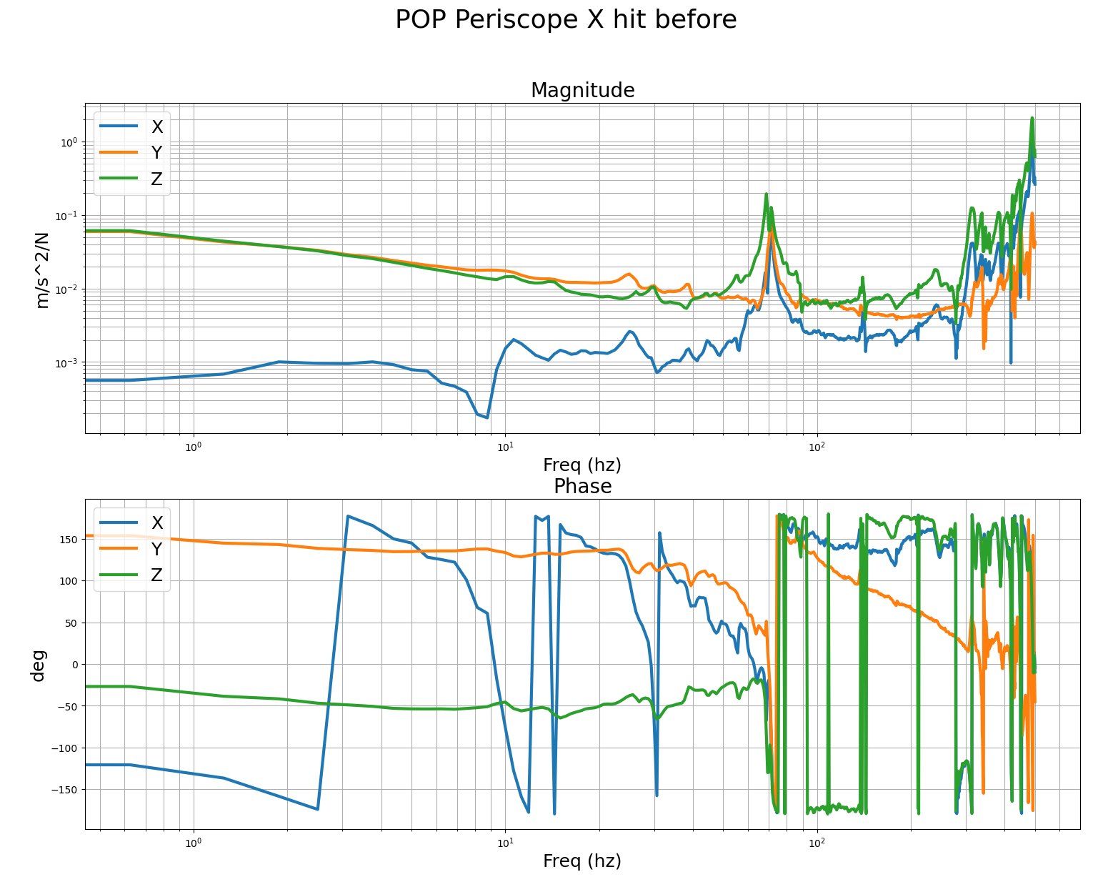 These are the measurements we got with the B&K of the POP periscope before and after adding the stiffener. For the POP periscope, we mounted the accel to the table, right at the foot of the periscope, and did the impacts at the top of the post. The accelerometer was mounted with the sensors Z aligned vertically, the Y axis was roughly parallel to the edge of the ISI, so it was mostly pointing along the IFO X arm. First and second images are impacts in the IFO X and Y dofs, you can pretty clearly see the 70hz post resonance. Third, fourth and fifth images are with the accelerometer in the same spot after adding the stiffener, it seems the mode has successfully been moved much higher to around 170hz. This should allow me to increase the ugf and loop gain quite a bit, to be more like the other ISI. I'll verify with tfs on the ISI after the vent.