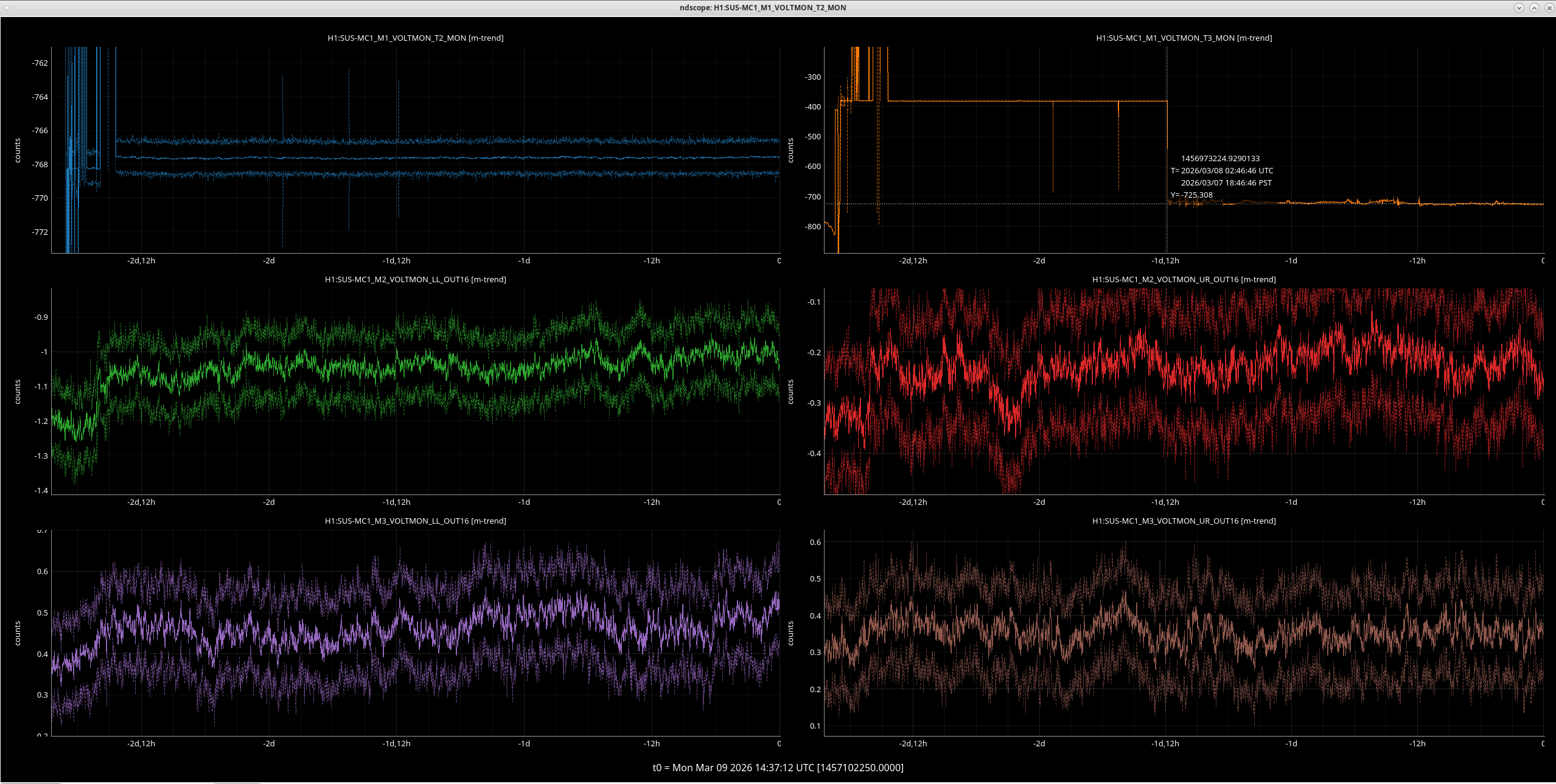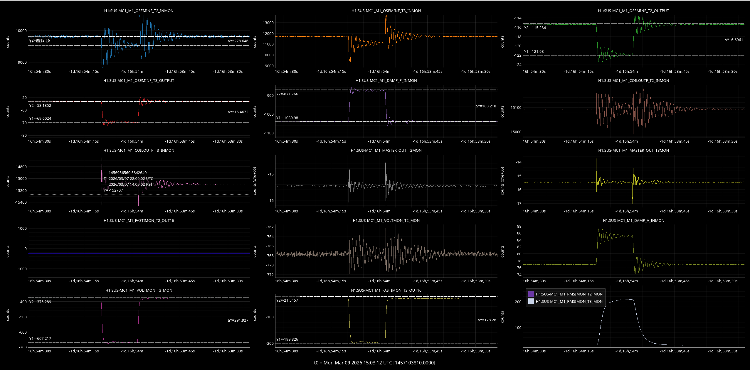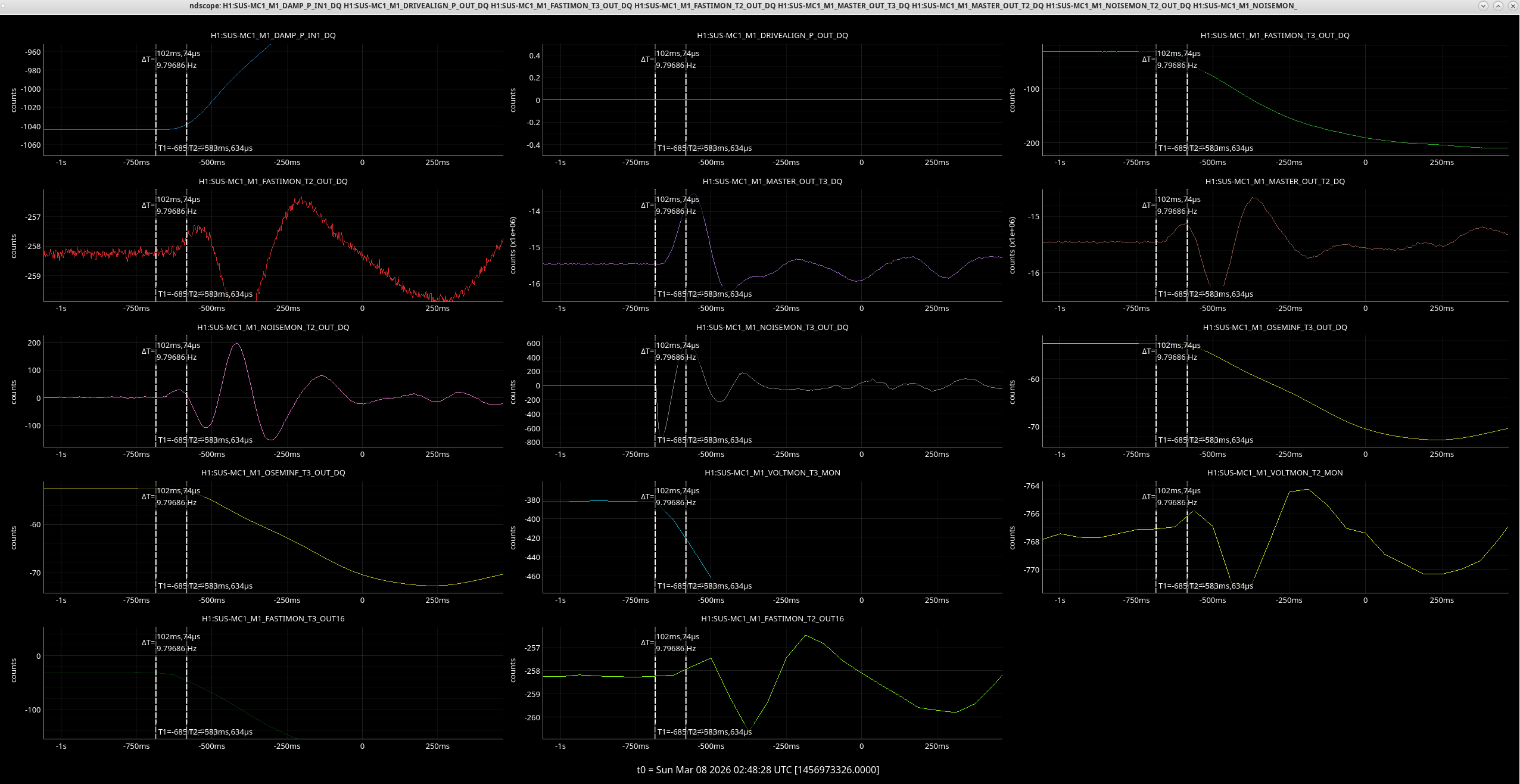 The second pic shows today with y cursors at the reference values. The biggest difference is IM2 pitch which is ~120 counts lowewr than it was, the other 2 DOFs are tens of counts off.