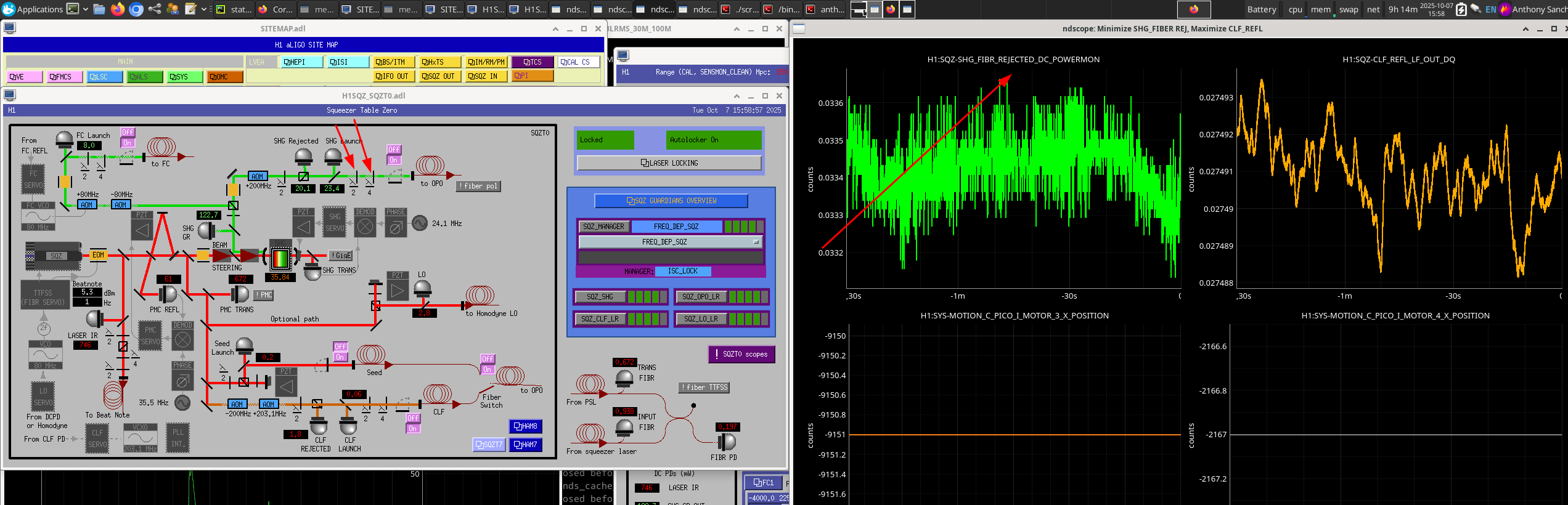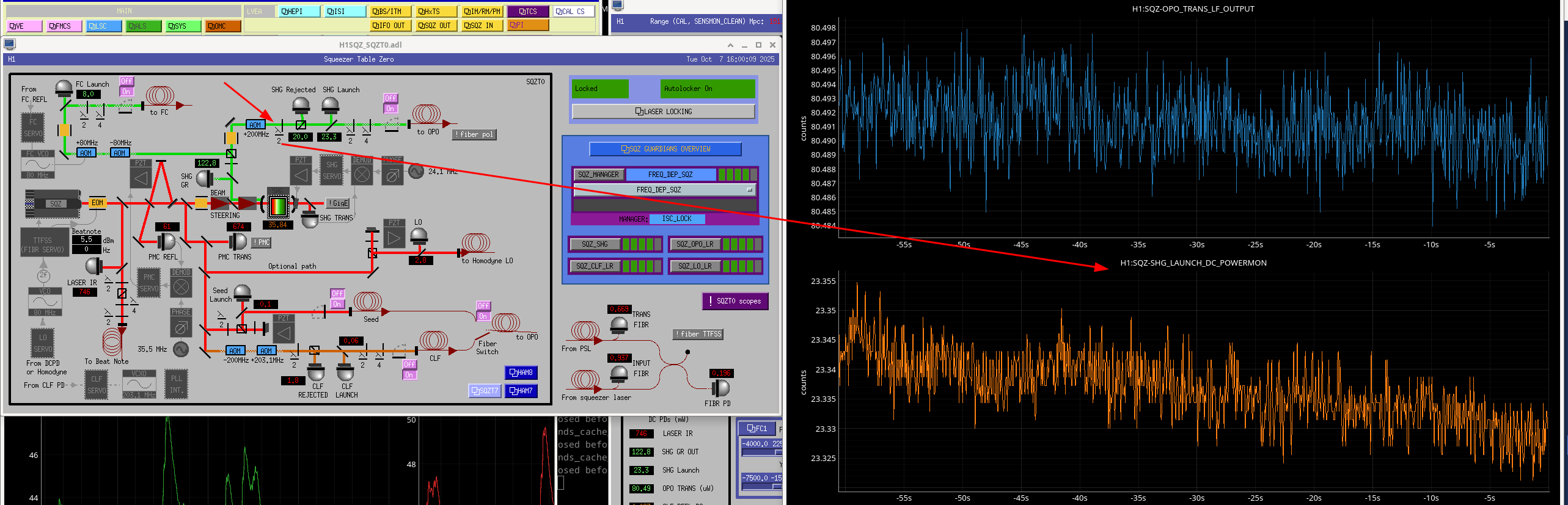 At this point started relocking SQZ normally, and discovered the OPO_LR was going into "siren mode"---basically in a fast cycle of going to DOWN + it had the notification about "pump fiber rej power in ham7 high...". To address the latter "common notification" involved working with SQZT0 waveplates (this was very likley do the big adjustment UP in SHG power I made).