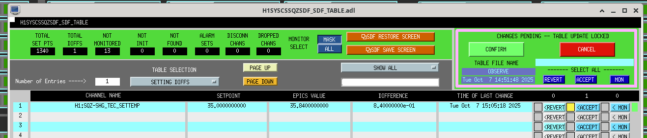 Eventually they were able to get SHG_FIBR_REJECTED_DC_POWERMON & SHG_LAUNCH_DC_POWERMON signals to their nominal values (these signals are also in Tony's screnshots, i.e. images #1 & #2). After 30+min of adjusting, the SQZ was able to lock & H1 was automatically taken to Observing as soon as the new SHG TEC SETTEMP was accepted in SDF (see image#3). H1 went to Observing just as Sheila was walking into the Control Room & able to assess and get a rundown of what happened.
