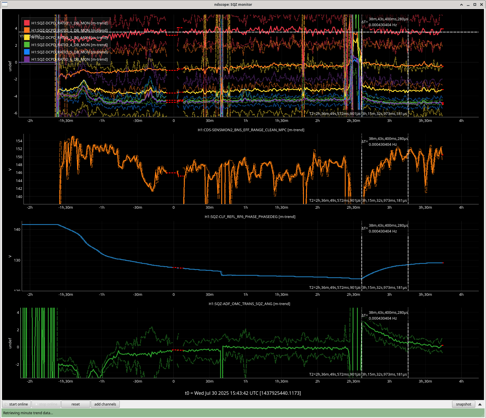 After Ryan adjusted the OPO temperature, there seemed to be a ~30minute to 1 hour time constant for the SQZ_ANG_ADJUST servo to bring the squeezing angle to the best for optimum squeezing, see attached. After this time, the range debatably improved. Although some of the improvement could be attributed to less earthquake ground movement. This time constant is slow but seems to be generally working well as the servo has not ran away since being implemented in 85820.