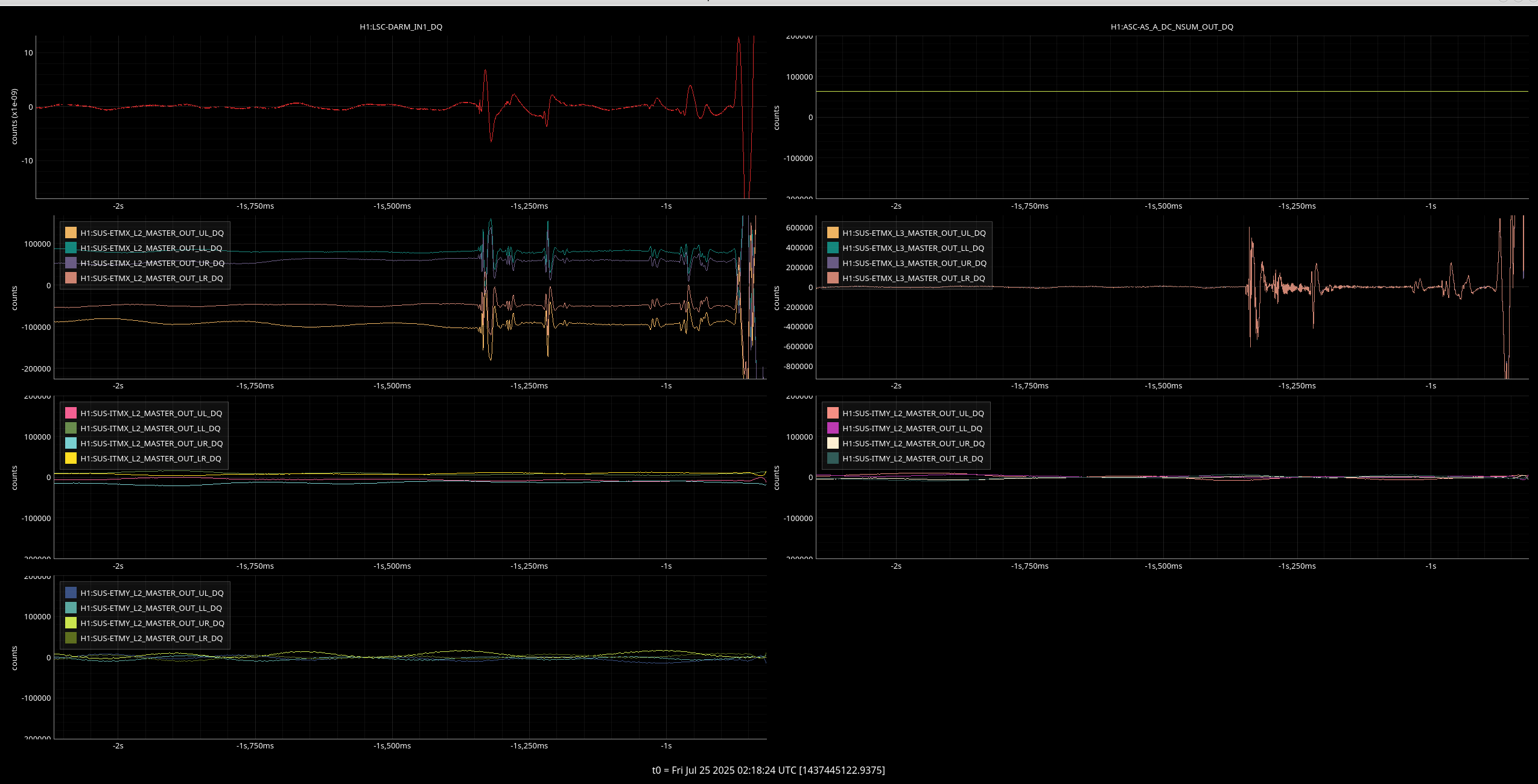 Generally, every yaw ASC loops sees this behavior, but it's hard to tell what is moving first, or the most, since the channels are not calibrated into useful units. As a note, the soft loops are not DC coupled, so I imagine they are just following the other loops. Our lockloss scopes plot the very slow ASC channels, so here is a faster plot of some of the ASC channels before one of these locklosses. The centering loop signals are moving away from zero, but not large enough that the beam is at the edge of the WFS.
