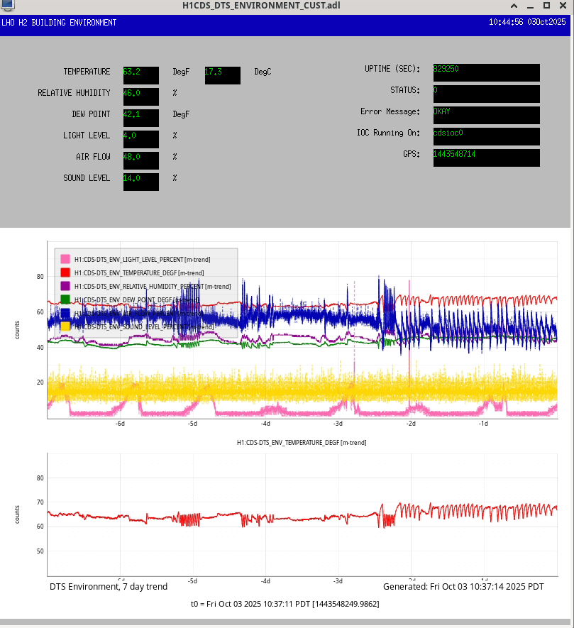 The "DTS ENV" block will turn RED if the server room temperature exceeds 80F. The block will turn MAGENTA if the dts_env_ioc GPS time falls behind by 10 minutes or more.