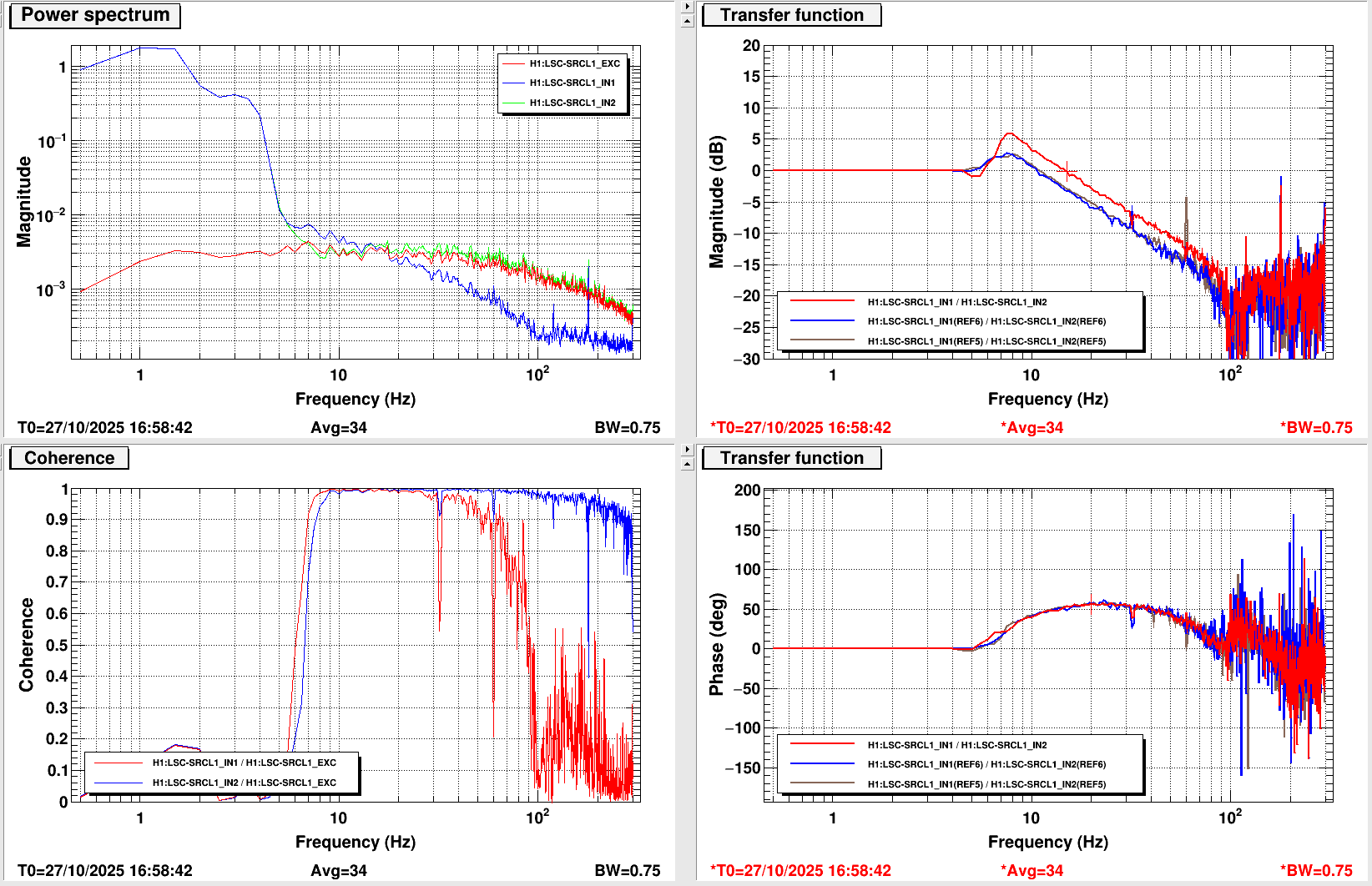 I don't have a sense of what exactly the problem is yet, but last week's adventure taught us that this 1 Hz instability is related to the gain of SRCL just as much as it is related to the DHARD, CHARD and CSOFT gains. I checked the SRCL UGF today when we reached NLN and it was at 10.5 Hz, which seems low even by these standards.