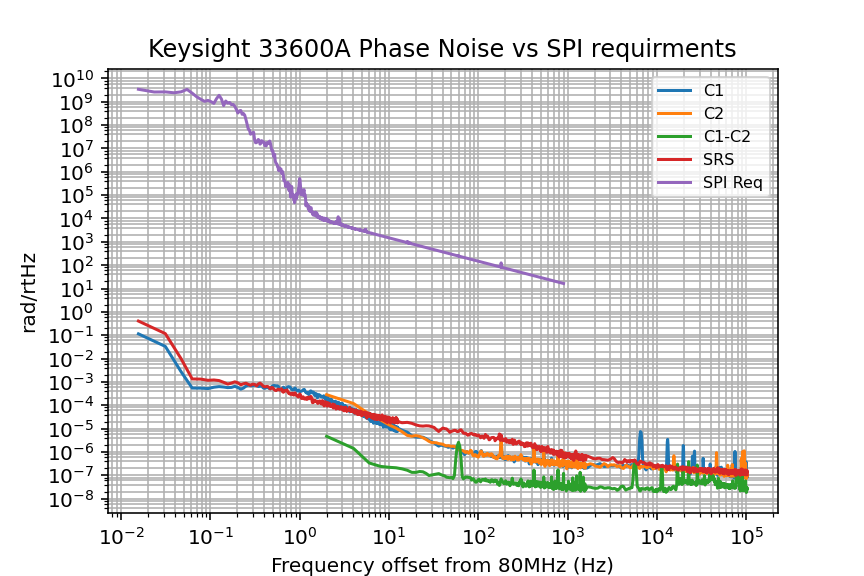 I took Phase noise measurements of the 2 channel Keysight 33600A waveform generator for its use in building SPI Pathfinder in the optics lab before install. Going only off of the phase noise graphs, it is sufficient as it shows comparable results to the SRS which had a phase noise considered to be good enough for SPI pathfinder.