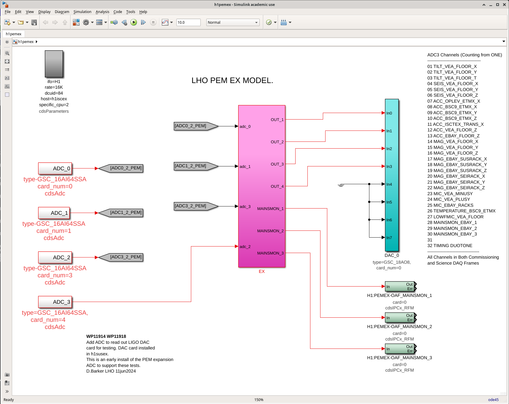J. Kissel, D. Sigg, D. Barker ECR E2100485 ECR E2200401 WP 12901 Continuing on the deprecation of 18-bit DAC path (ECR E2100485), we upgraded the h1iscex's DAC0 card today from an 18- to a 20-bit DAC. One of the front-end models that use that DAC is the h1pemex model. Here's the before vs. after for the models. While there, I found and left the new ADC card from ECR E2200401's PEM sensor array expansion. I'd thought it was installed solely for characterizing the 32CH LIGO DAC, but it had only been temporarily used for that. It should be there! And also, the electric field meter ADC should also remain there. If the PEM team wants to account for the factor of 4x gain change in the DAC calibration, I installed new DACOUTF filters upstream of the GDS filters that are used to drive the DACs. The model has been committed to /opt/rtcds/userapps/release/pem/h1/models/ h1pemex.mdl : r28026 --> r34059